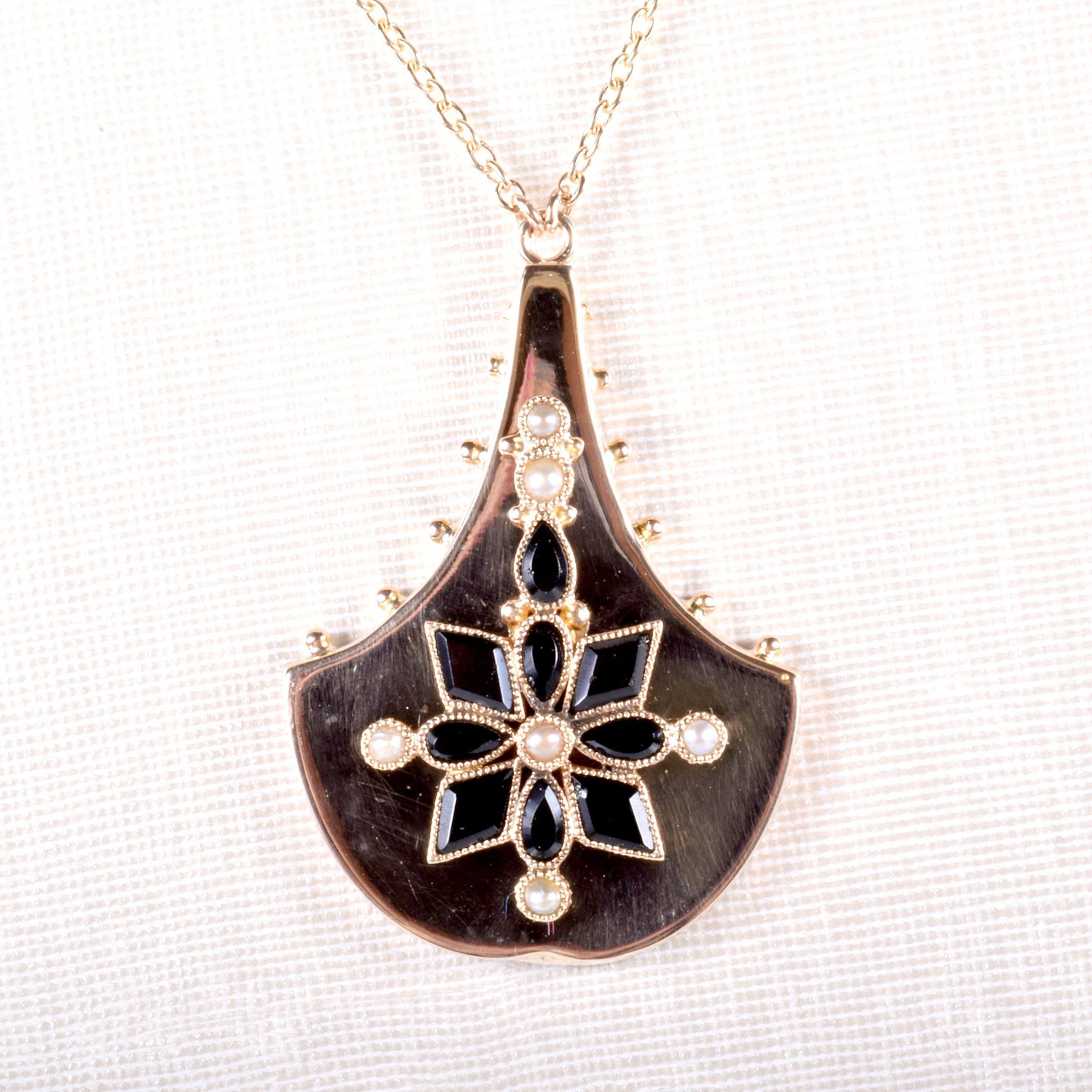Antique Necklace - Antique Victorian 14k Yellow Gold Onyx & Seed Pearl Conversion Pendant Late 1800's 14k Yellow Gold Black Onyx Seed Pearls Pendant measures approximately 1 1/8" tall and 3/4" wide. New 14k yellow gold chain is 17" with a jump ring at 16".