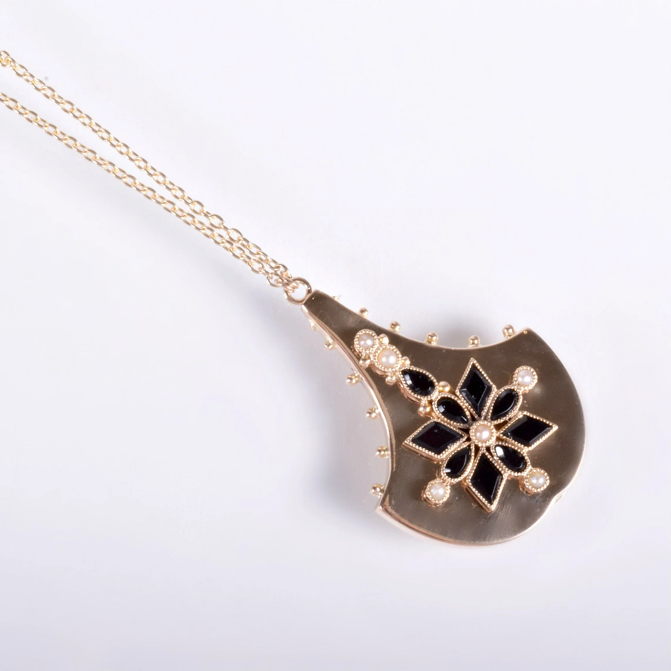 Antique Necklace - Antique Victorian 14k Yellow Gold Onyx & Seed Pearl Conversion Pendant Late 1800's 14k Yellow Gold Black Onyx Seed Pearls Pendant measures approximately 1 1/8" tall and 3/4" wide. New 14k yellow gold chain is 17" with a jump ring at 16".