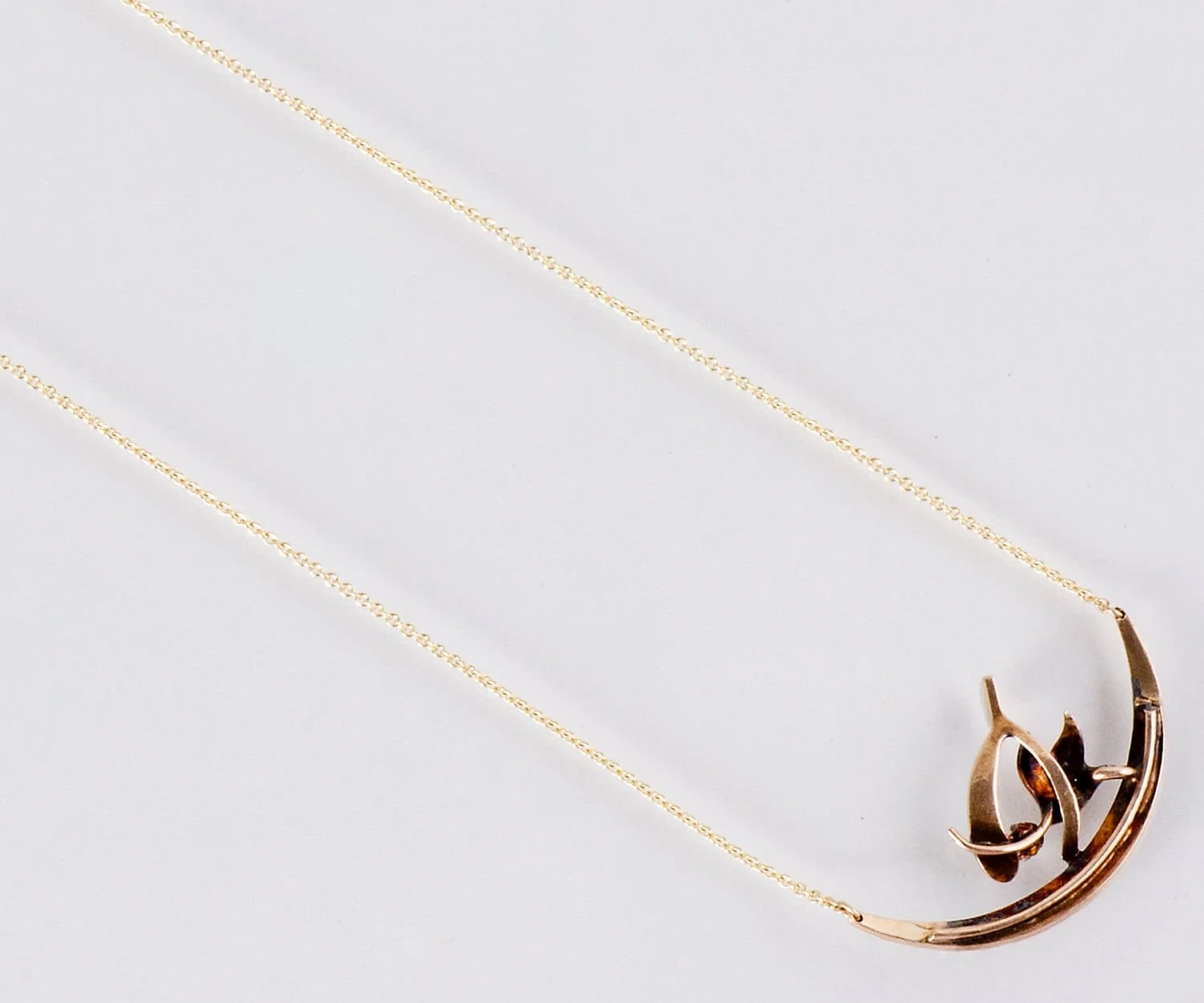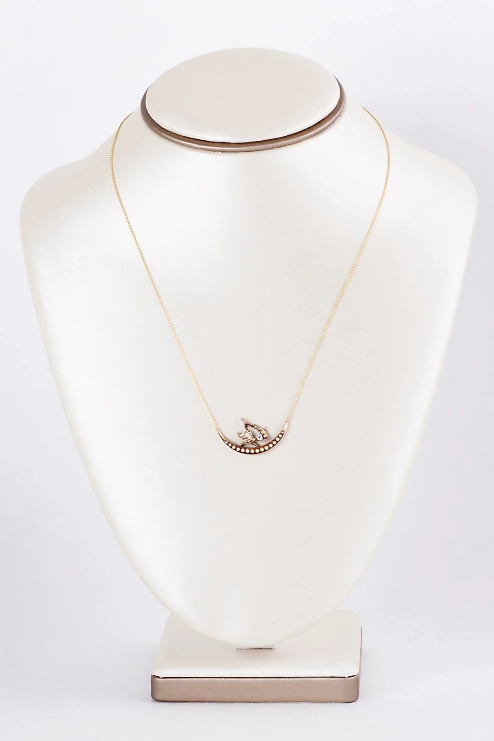 Here we have a very lovely natural seed pearl filled crescent moon with a tiny flower, sparkling diamond and wishbone perched daintily on top. We think it will bring someone very special lots of good luck! This charming antique necklace would be perfect for the new bride on her special day or for everyday wear.