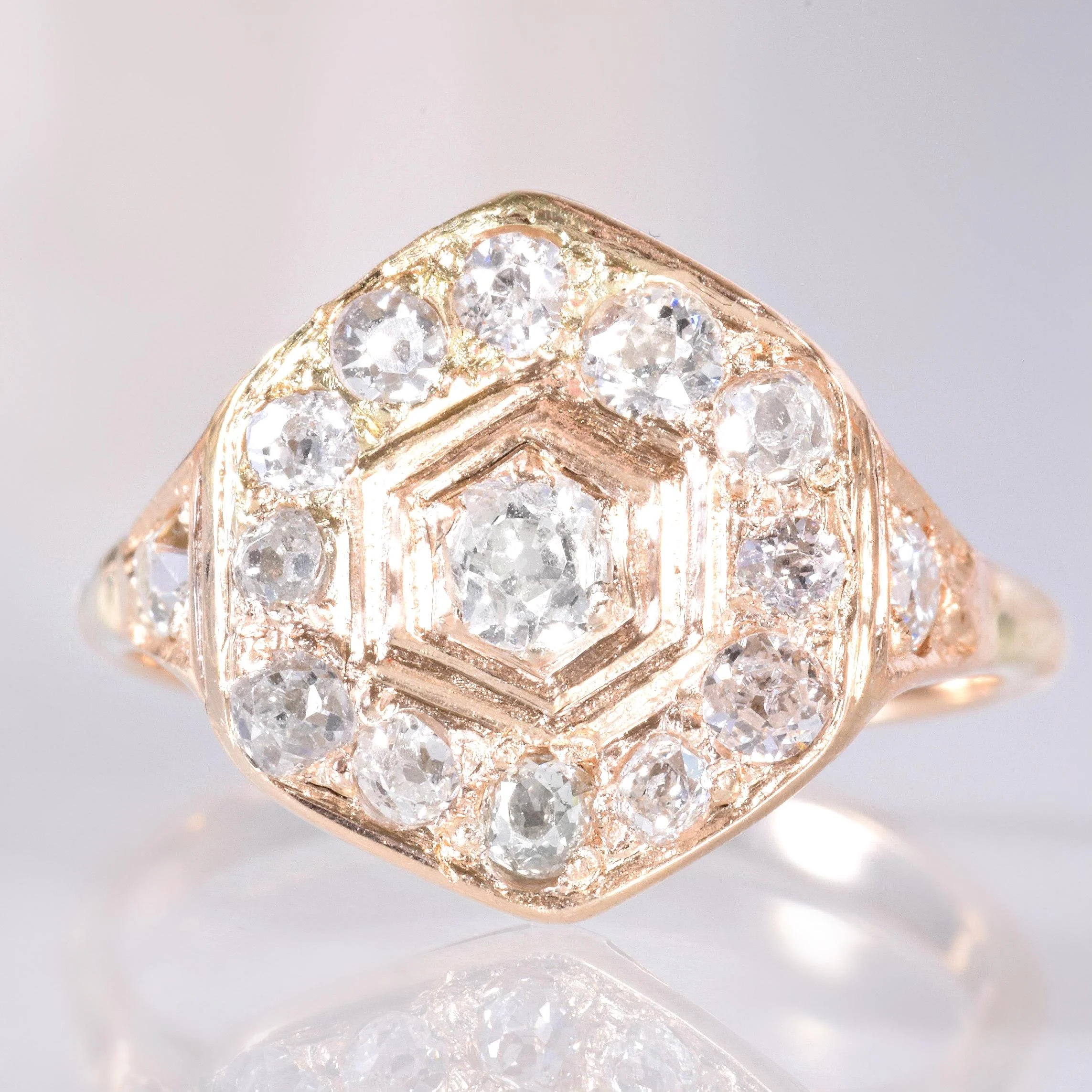 Ok, wow, just wow is this magnificent antique cluster diamond ring! The yellow gold crafted throughout the setting is bright and bold amid over a carats worth of mine-cut diamonds that form a six sided presentation. Lovely and very low profile and a perfect engagement or right-handed treasure of a ring!