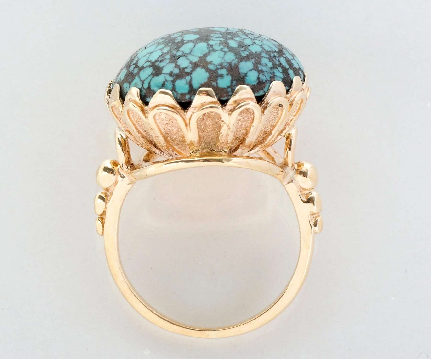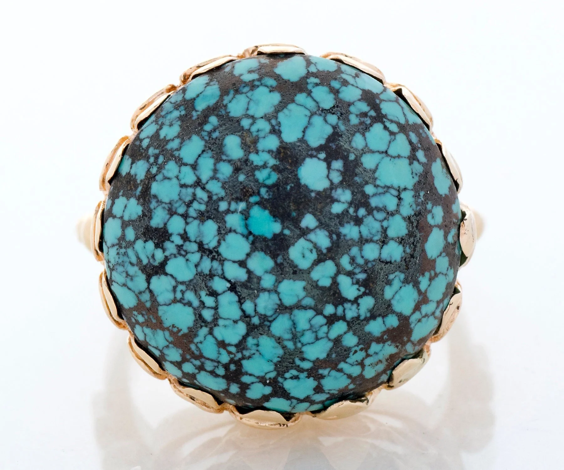 What a statement piece is this significantly sized spiderweb turquoise antique ring! A decorative, scalloped basket holds the turquoise, appearing like a big blooming flower. Coming from the 1930's, this beauty of a ring was crafted in 14k rose gold which contrasts amazingly with the turquoise.