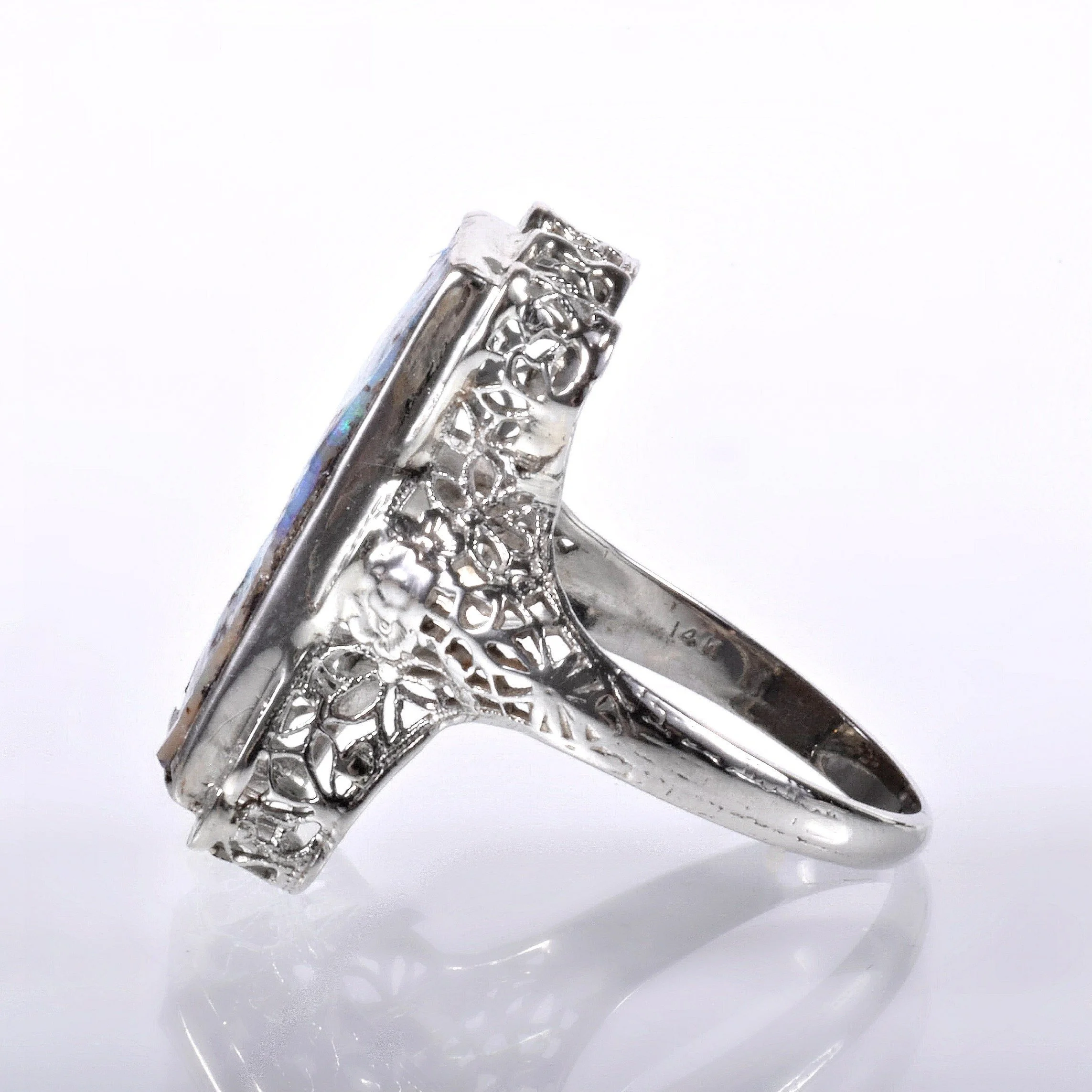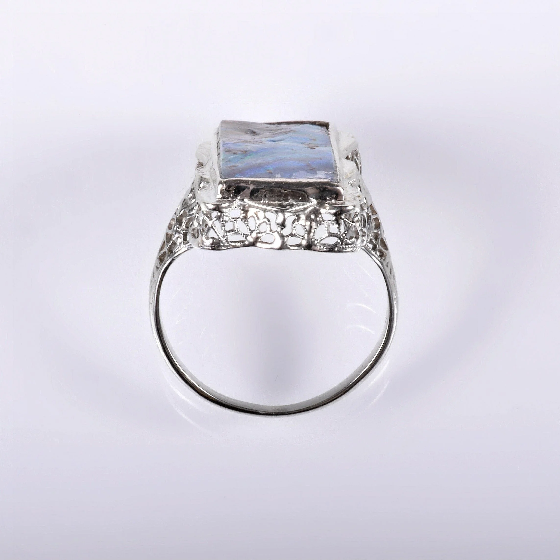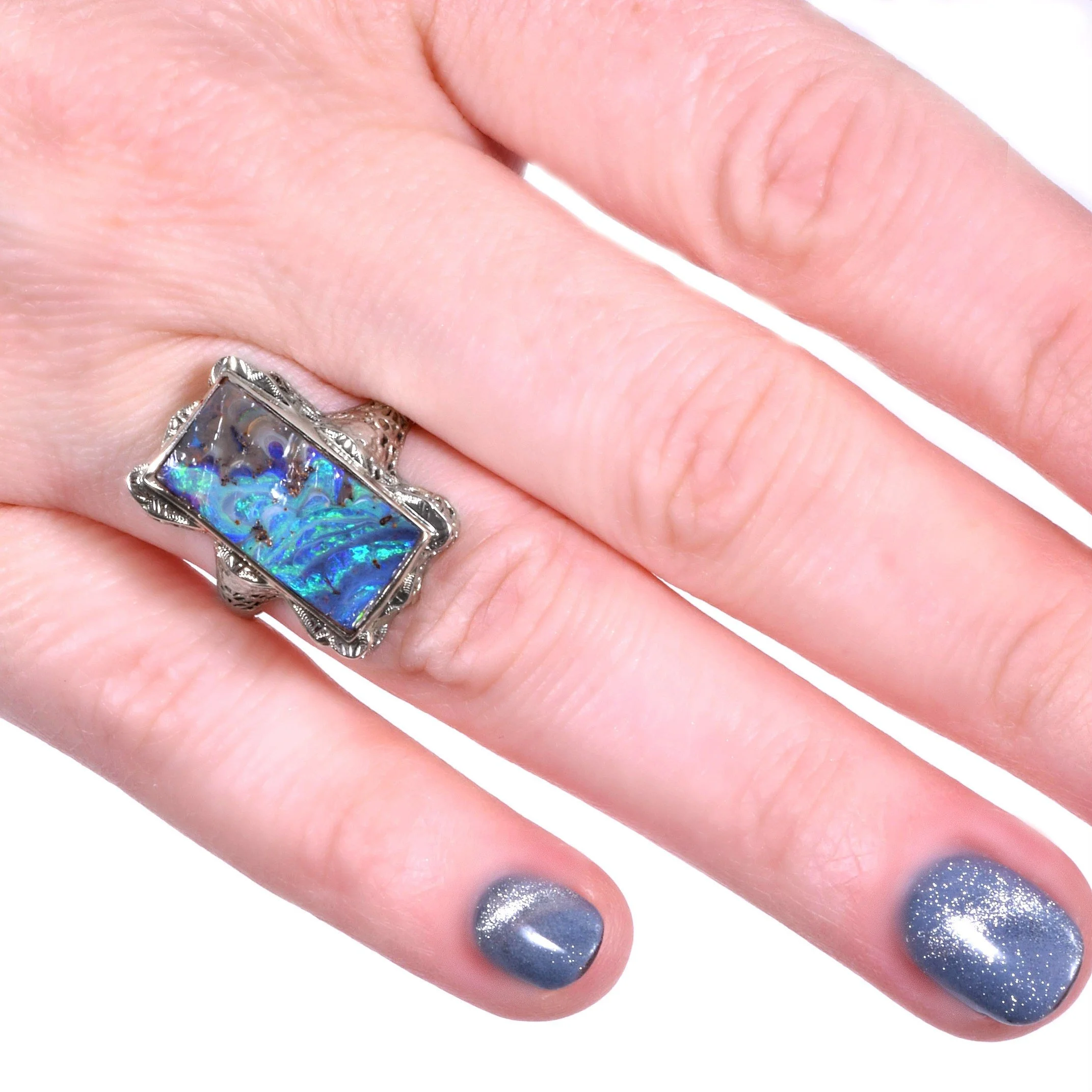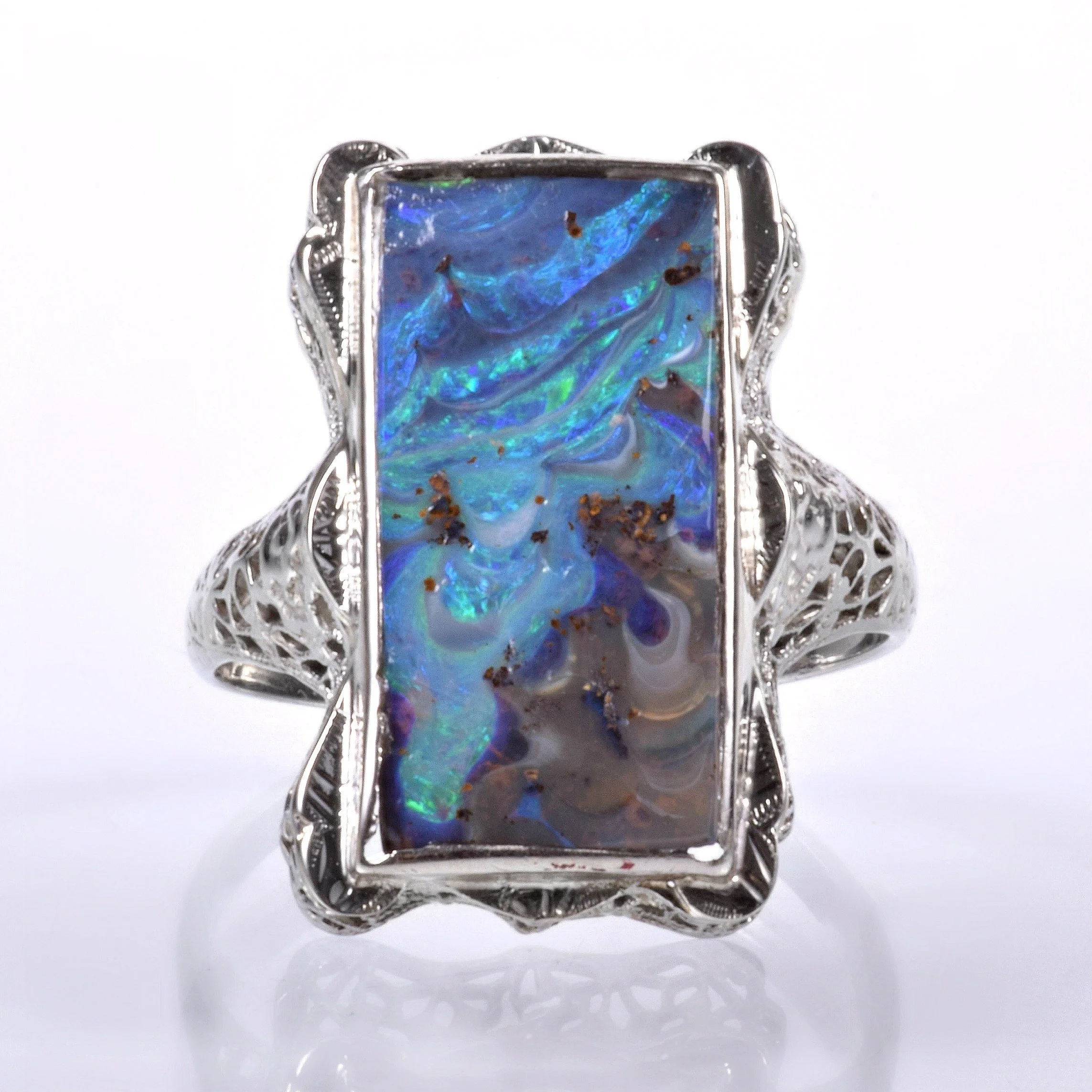 Antique Ring - Antique 14k White Gold 4.52ct Boulder Opal Ring 14k White Gold Circa 1920's Rectangular Boulder Opal =4.52cts Ring Size 5 (should fit more like a 5.5 with underneath opening) Ring measures approximately 20mm tall at the center, back of band is 1.9mm wide.