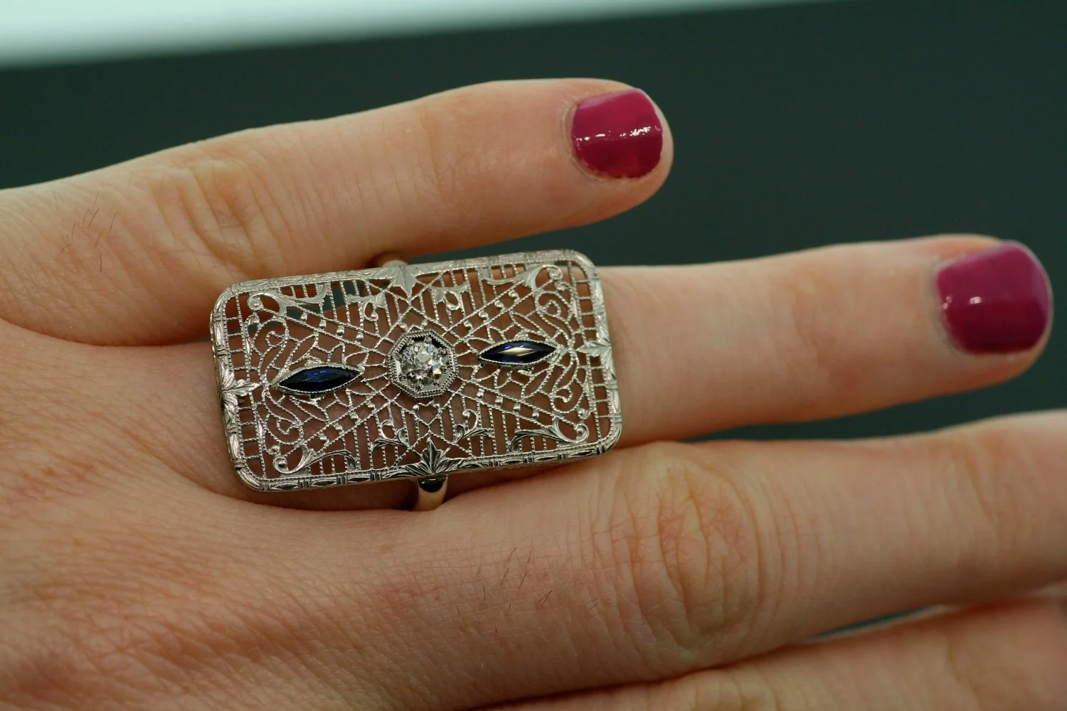 This lace-like intricate filigreed beauty lived its first life as a brooch and we are sure it was well loved. Now, reimagined in our shop, a unique ring to ooh and ahh about! At the center of this decorative treasure is a brilliant European cut diamond, sparkling away. Two marquise cut blue sapphires adorn each side making this piece of history so eye-catching.