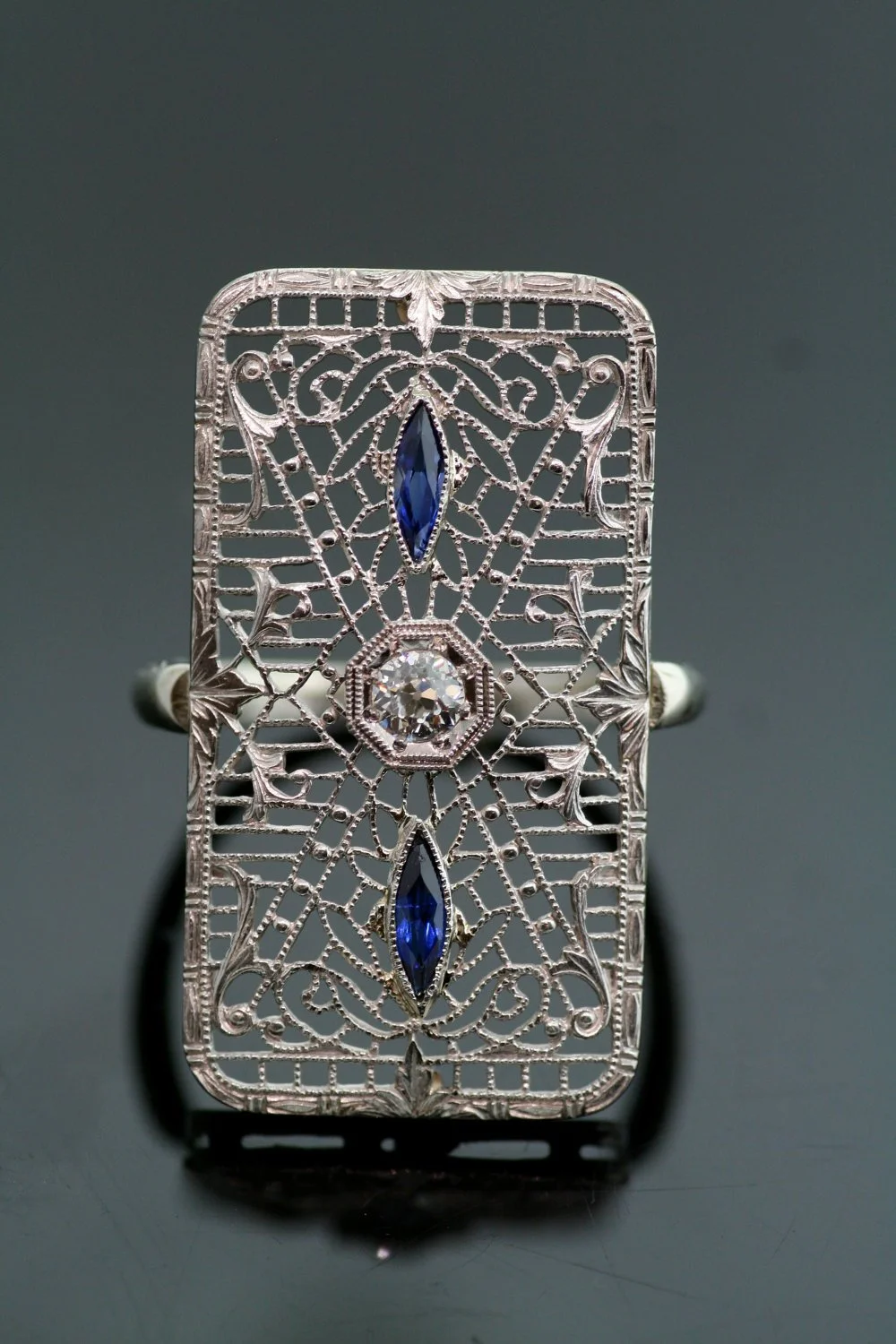 This lace-like intricate filigreed beauty lived its first life as a brooch and we are sure it was well loved. Now, reimagined in our shop, a unique ring to ooh and ahh about! At the center of this decorative treasure is a brilliant European cut diamond, sparkling away. Two marquise cut blue sapphires adorn each side making this piece of history so eye-catching.