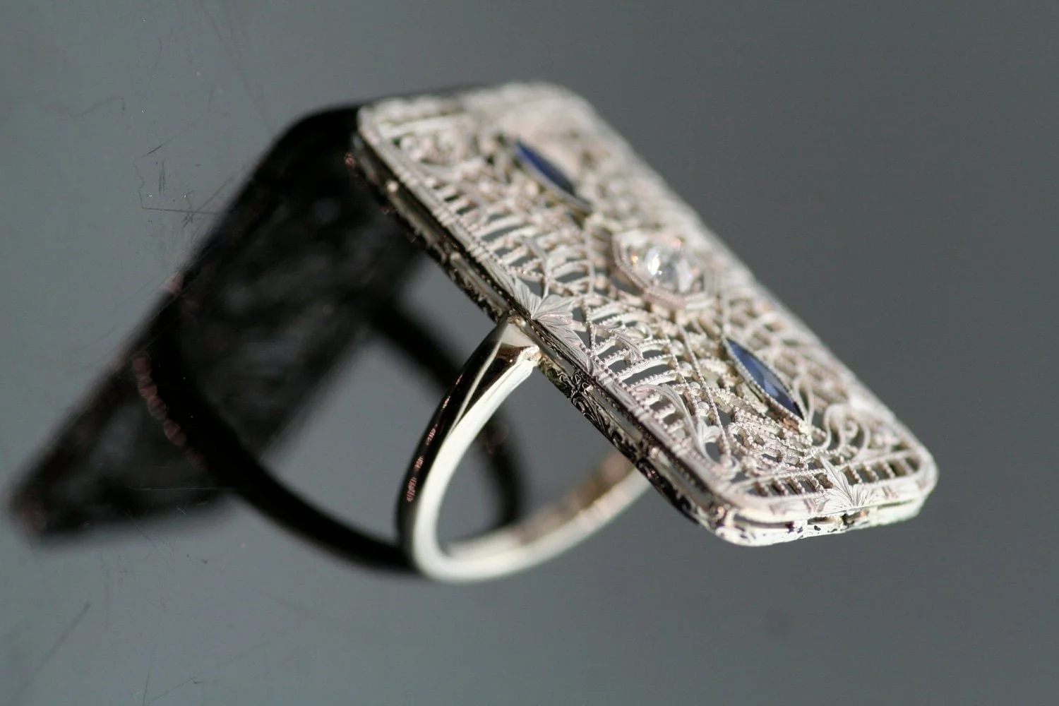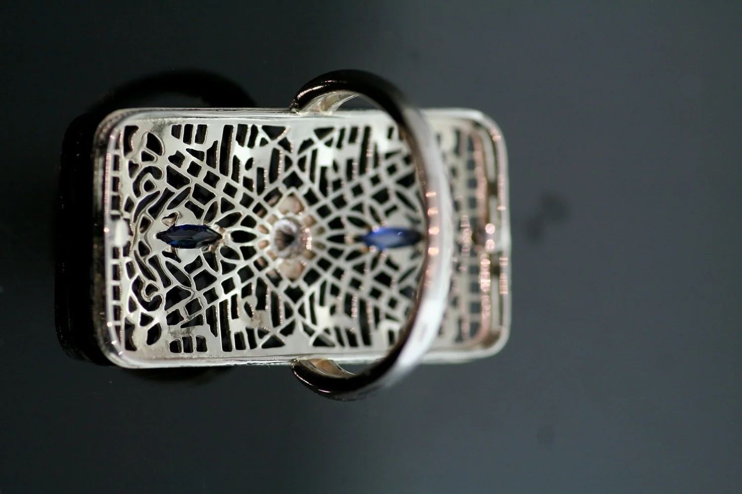 This lace-like intricate filigreed beauty lived its first life as a brooch and we are sure it was well loved. Now, reimagined in our shop, a unique ring to ooh and ahh about! At the center of this decorative treasure is a brilliant European cut diamond, sparkling away. Two marquise cut blue sapphires adorn each side making this piece of history so eye-catching.