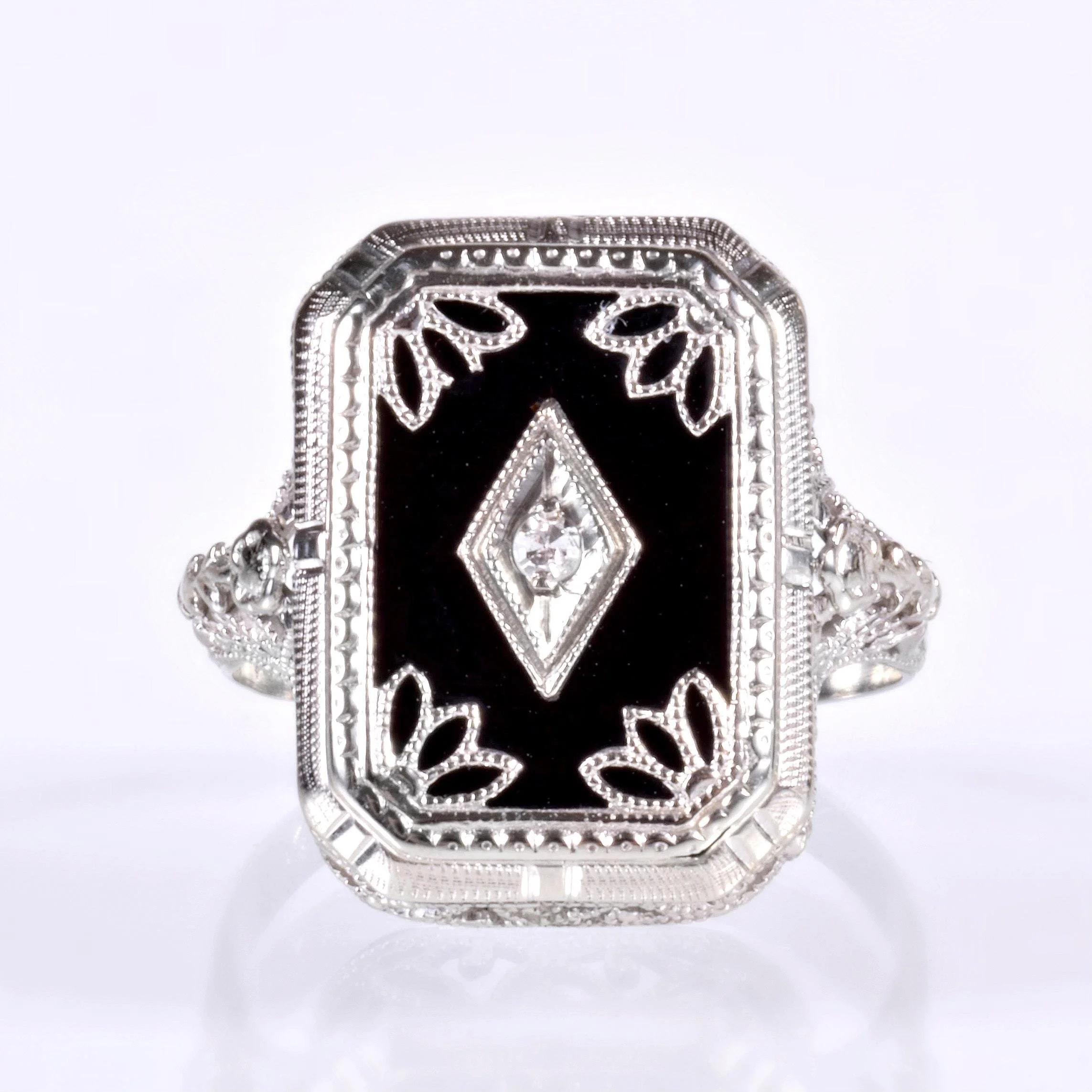 Antique Ring - Antique 14k White Gold Onyx & Diamond Filigree Statement Ring Circa 1920's 14k White Gold Black Onyx Single Cut Diamond =.02ct Ring Size 4.75 (sizable) Ring measures approximately 16.7mm tall at the center, back of shank is 2.3mm wide.