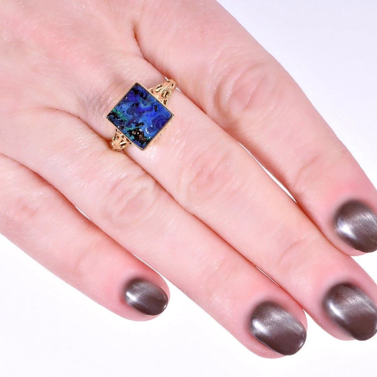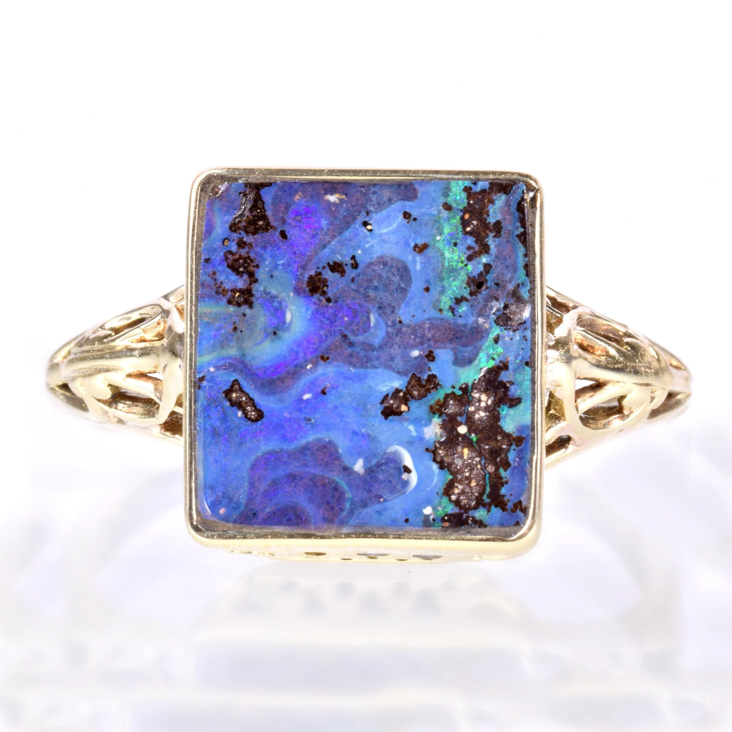 Sometimes it's good to be square! We love and admire the boulder opal in our shop and we really enjoy pairing this magnificent gemstone with our antique mountings whenever it makes sense. In this case.... a marriage made in heaven! Not an elaborate ring, but a ring that is stupendous in its simplicity. However, as you look around, every angle shows stunning details. Crafted in 15k bright yellow gold (great contrast!), this setting comes to us from the 1910's. Definitely a head-turner!