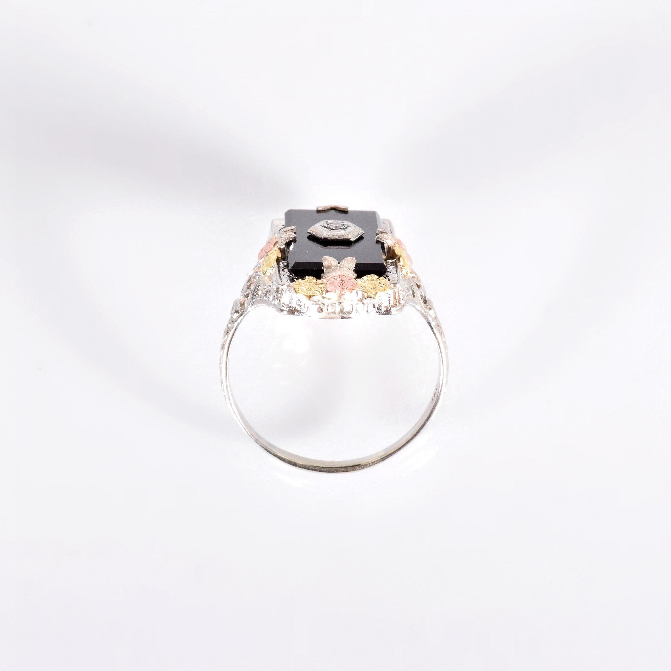 Fun, feminine, and flashy, but not TOO flashy! This elongated Black Onyx and Diamond ring is set in a fabulous, eye-catching setting. Created using white, green and rose gold, with a framework of gorgeous open filigree work. Delicate blossoms and leaves of gold dotting themselves on the outside of the Onyx, making the most lovely framing details on this antique treasure, with a tiny sparkling diamond in the center. This ring will look great with pretty much anything in your wardrobe, from jeans to evening wear. Its a beauty to add to your jewelry collection.