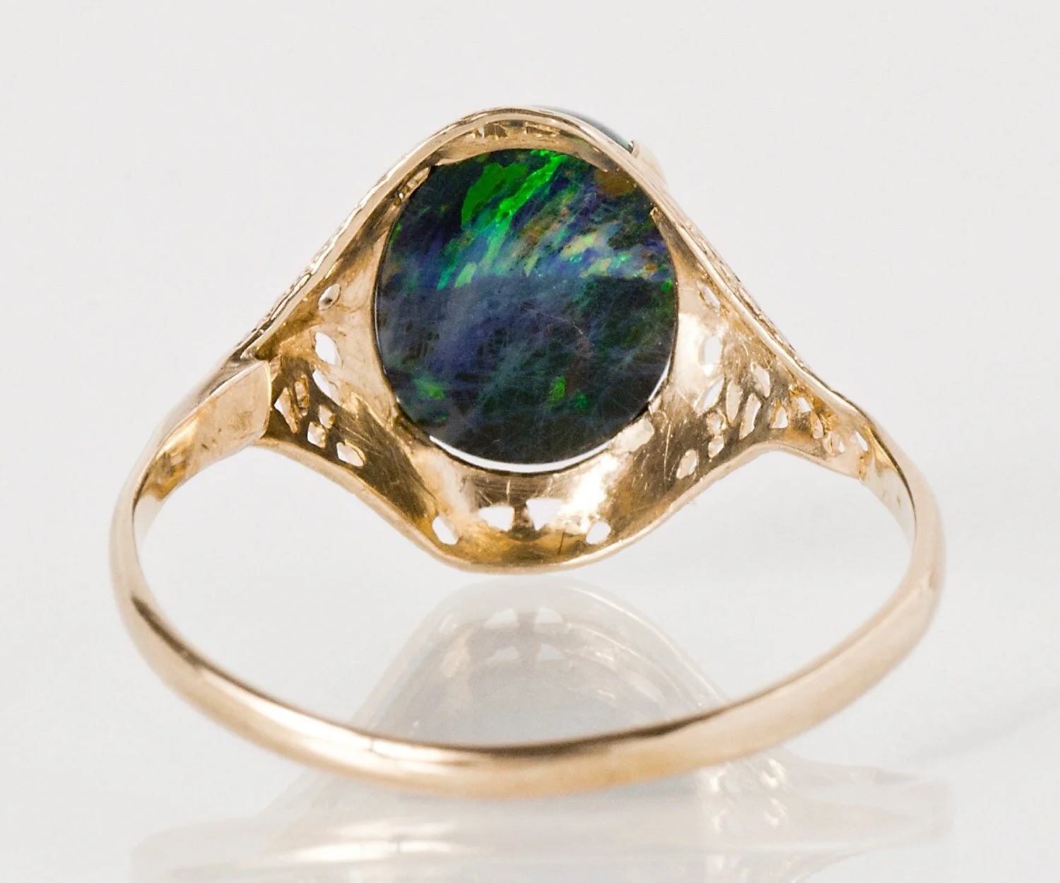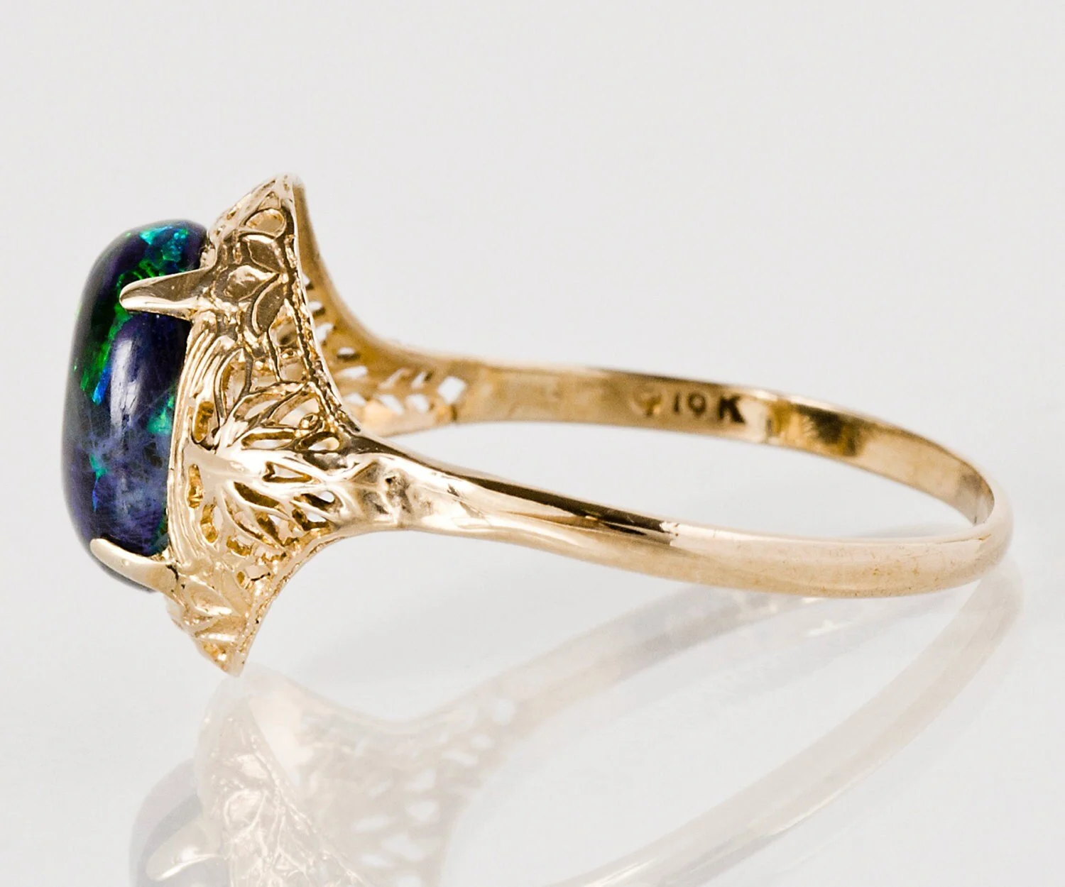 If you covet black opals, this is a fabulous choice for you. Flashes of green, yellow, purple and blue will delight the observer. This lovely antique opal is surrounded by bright yellow filigree work which we think showcases this special stone just perfectly.