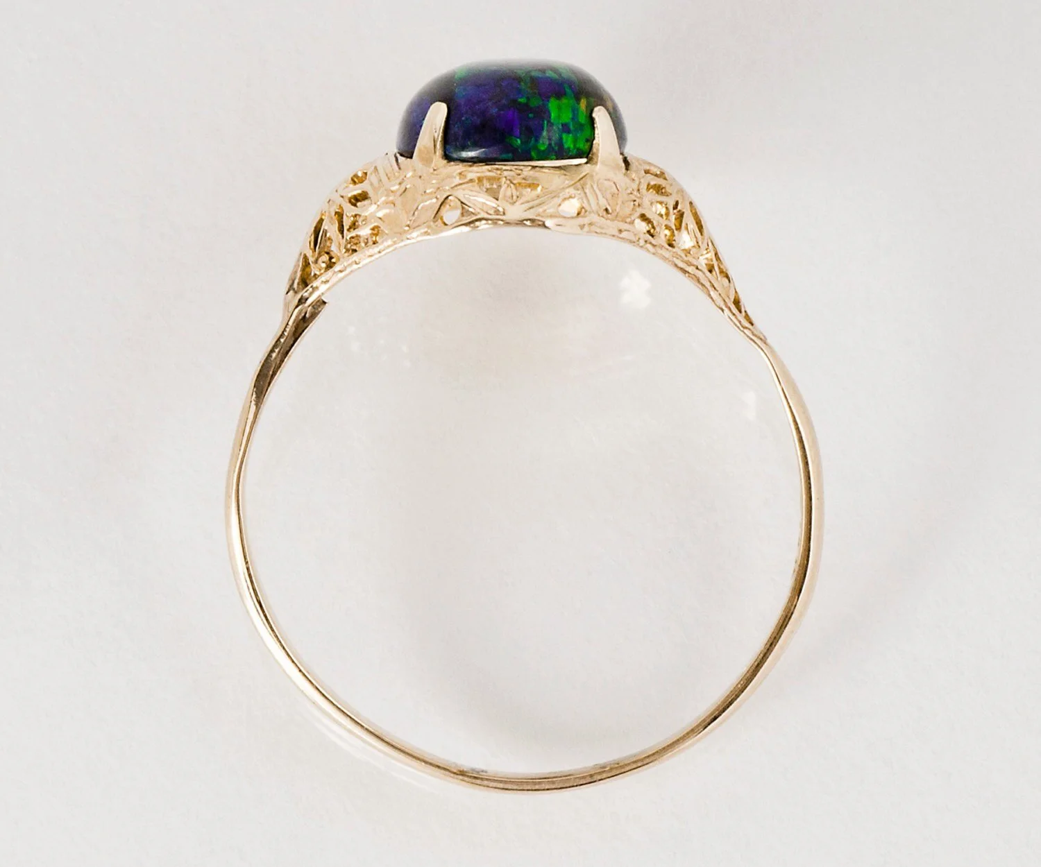 Antique Ring - Antique 1920's 10k Yellow Gold Filigree Black Opal Ring 10k Yellow Gold Black Opal =1.57ct Ring Size 8 Ring measures approximately 13mm at center, back of band is 1.5mm.