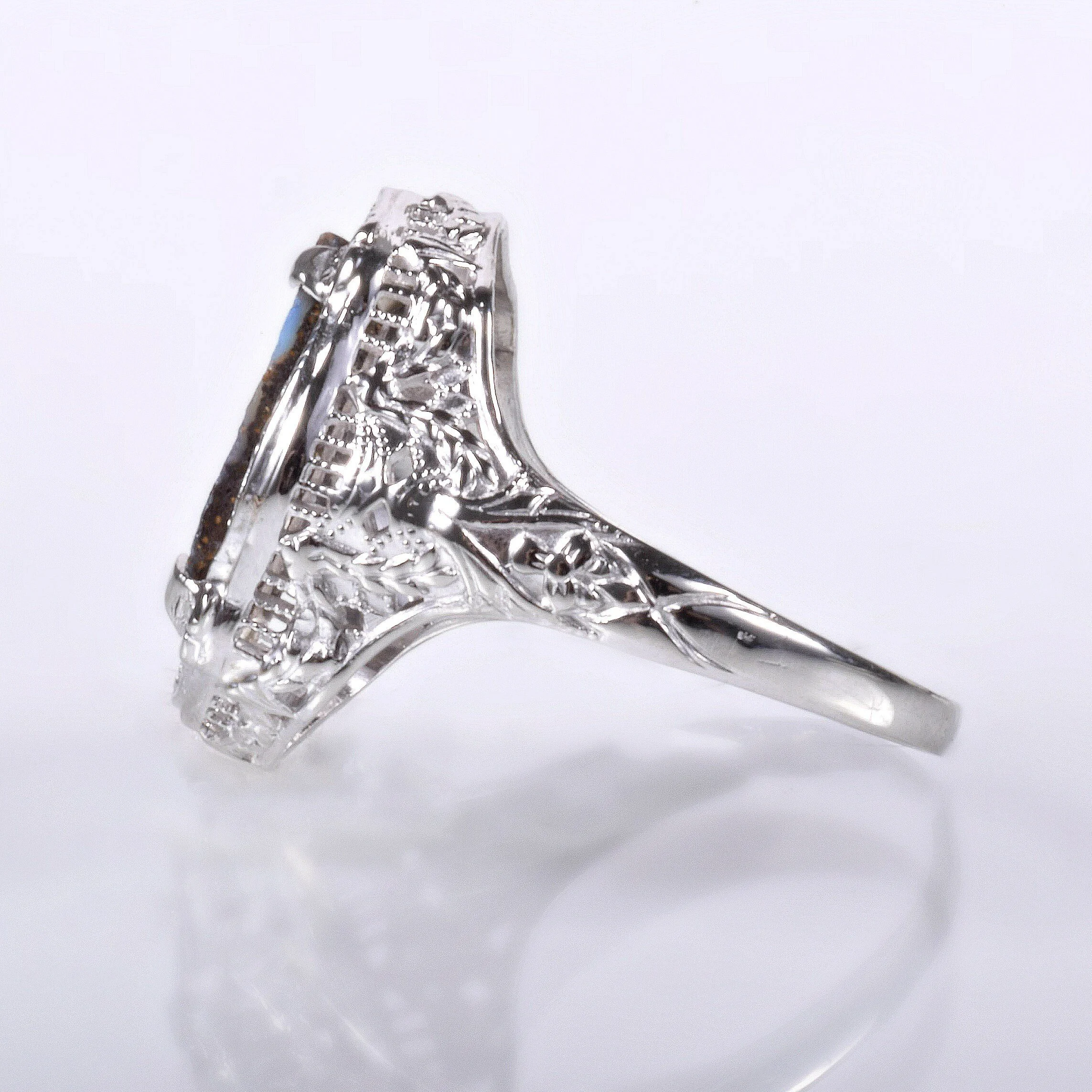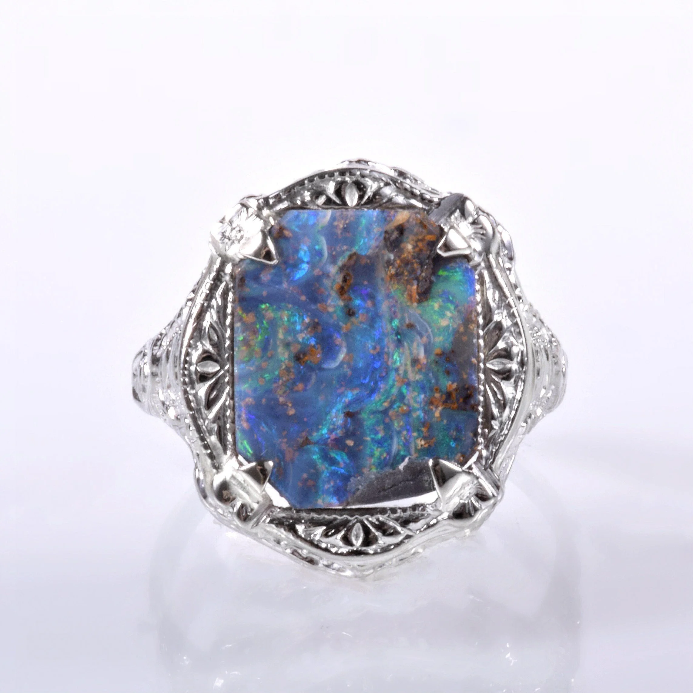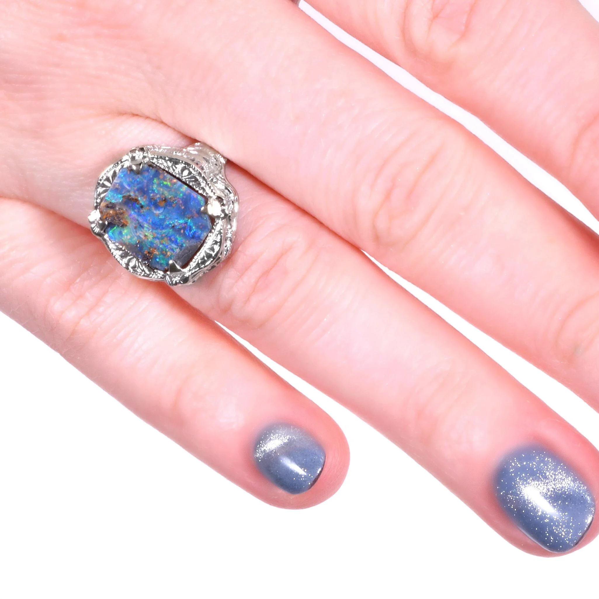 The boulder opal in this enchanting 14k white gold antique mounting is truly magnificent, reminding us of a painting. This ring comes to us from the 1920's, and the details are impressive and quite textural. Displayed is killer wirework, and sweet floral and nature motif engraving. If you love the boulder opal, this one is just lovely in its setting and would make a wonderful heirloom one day!