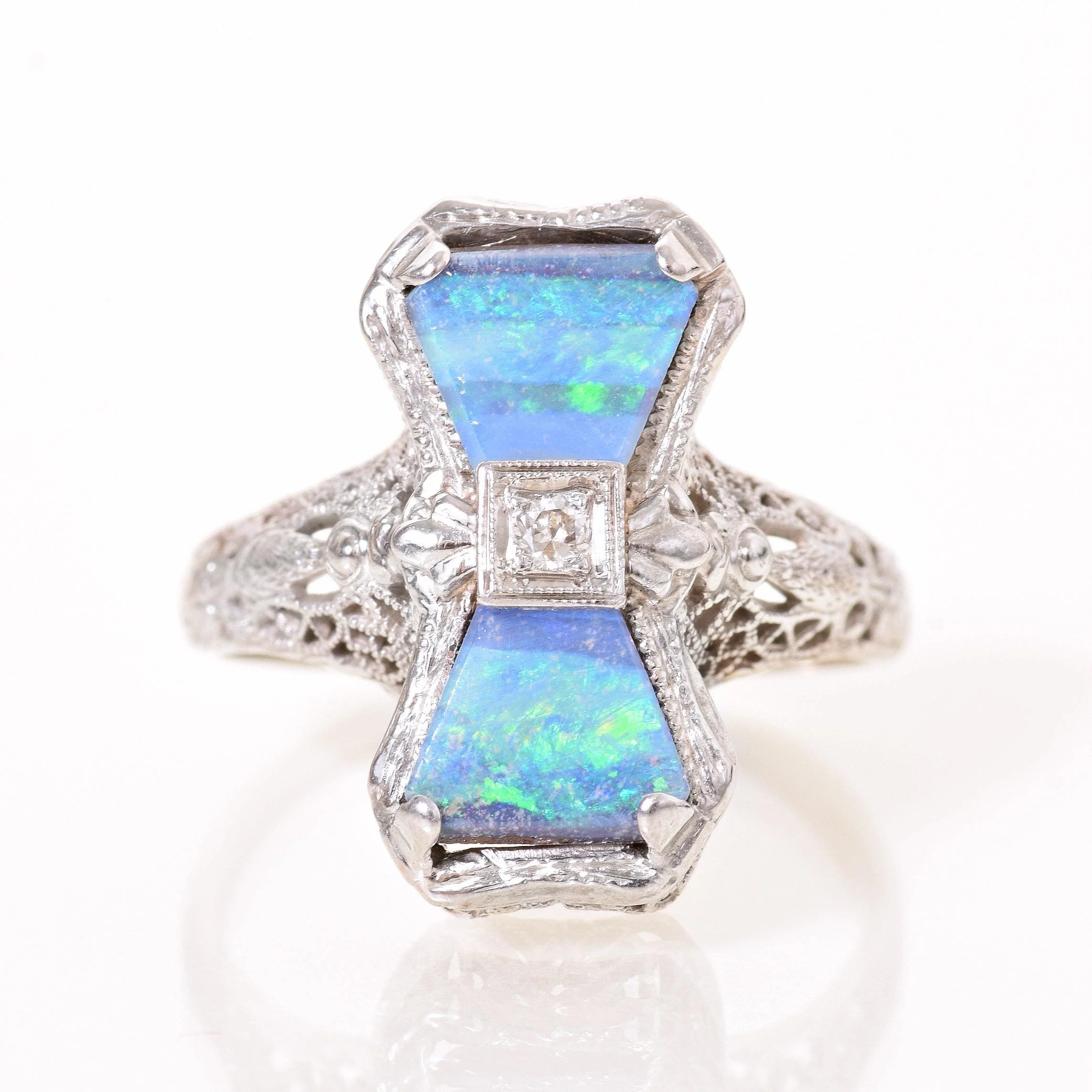 Simply arresting is this stunning antique double opal ring! The boulder opals display such an amazing play of color and they are set in a fabulous fine filigree Belais setting. Crafted in 14k white gold, there is a tiny European cut diamond at the very center, adding just the right amount of sparkle. Belais was a coveted designer in the 20's and one of the first manufacturers of white gold.