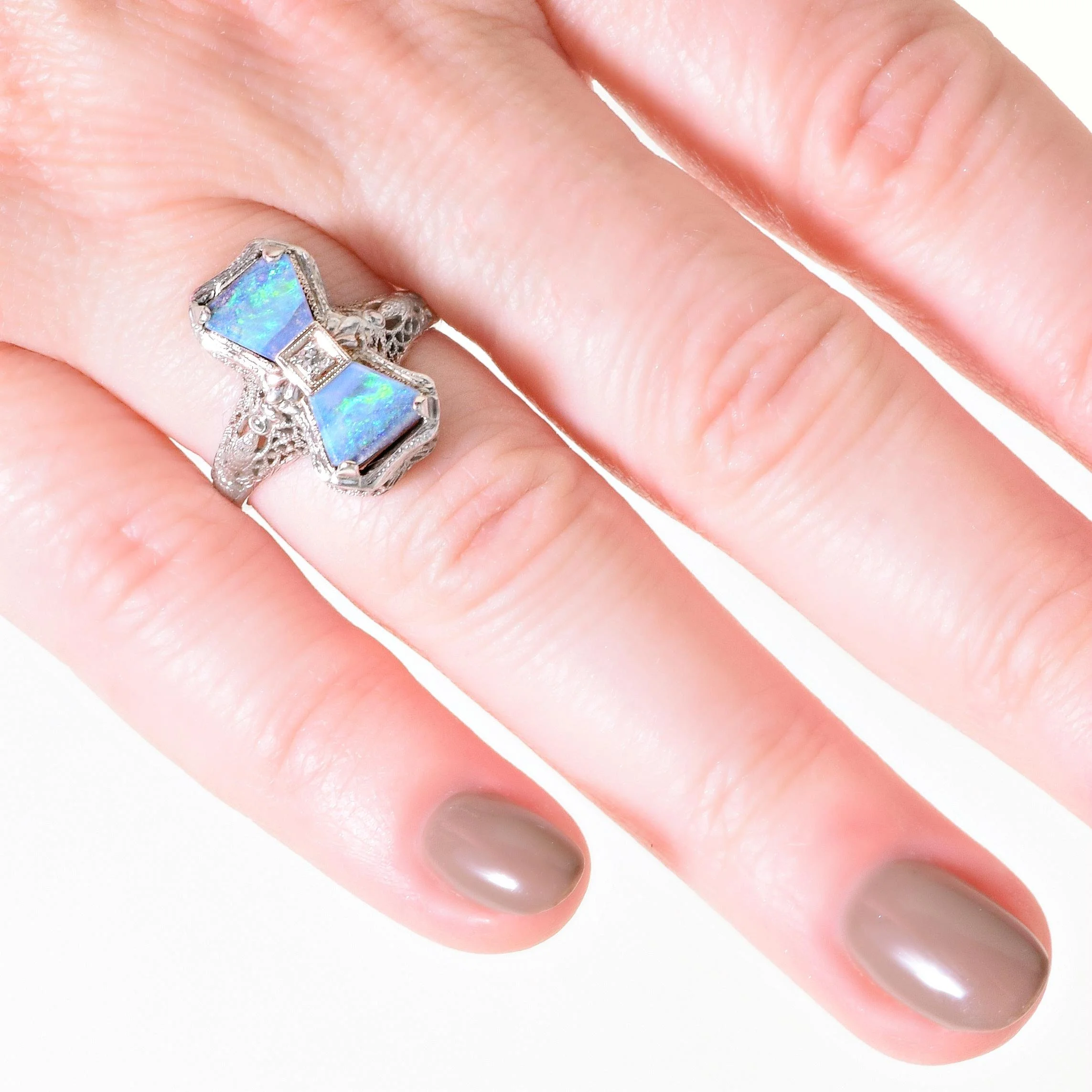 Simply arresting is this stunning antique double opal ring! The boulder opals display such an amazing play of color and they are set in a fabulous fine filigree Belais setting. Crafted in 14k white gold, there is a tiny European cut diamond at the very center, adding just the right amount of sparkle. Belais was a coveted designer in the 20's and one of the first manufacturers of white gold.