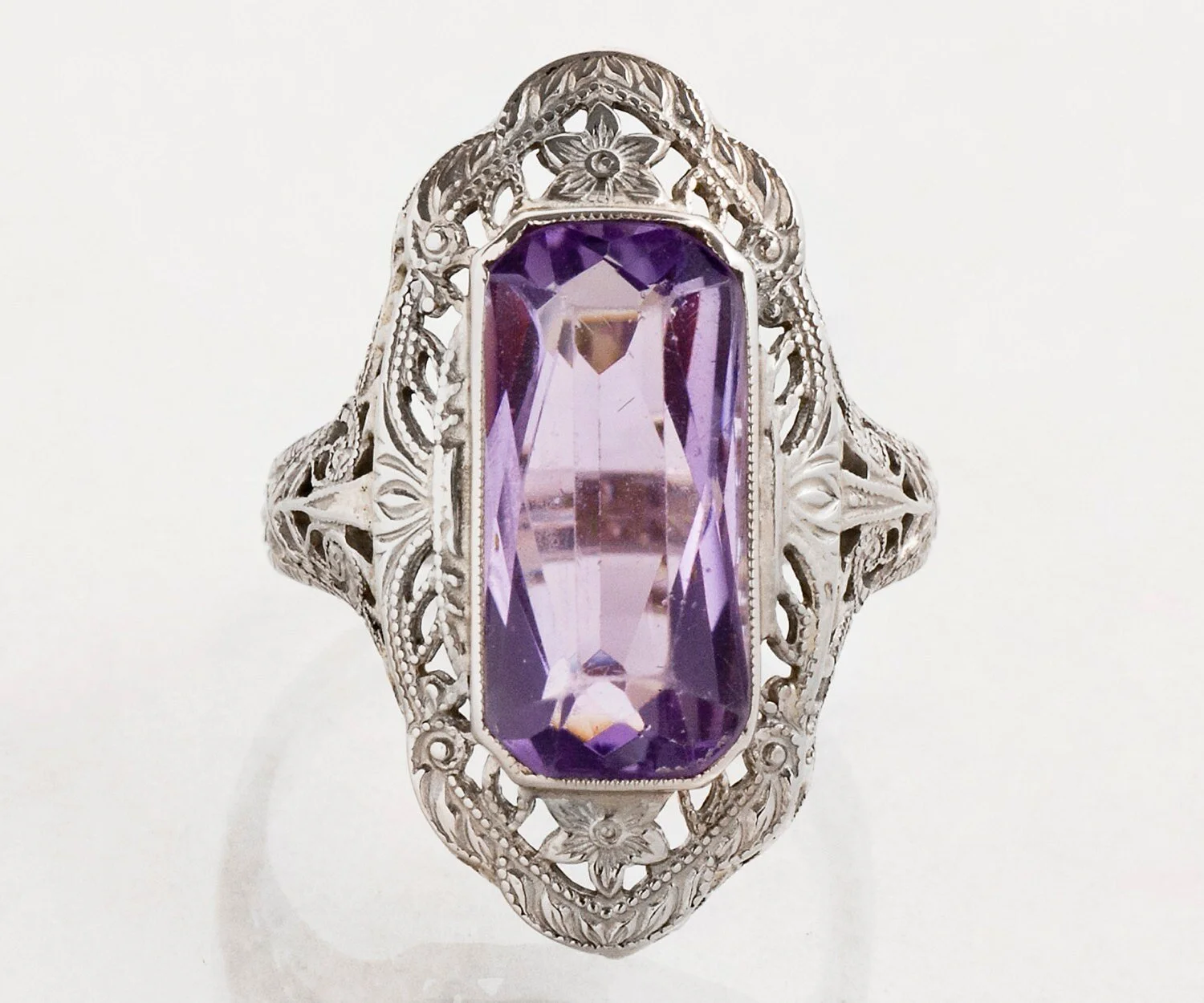 Antique Amethyst Ring 14k White Gold Amethyst Filigree Ring Size 4.75 (ring is sizable)