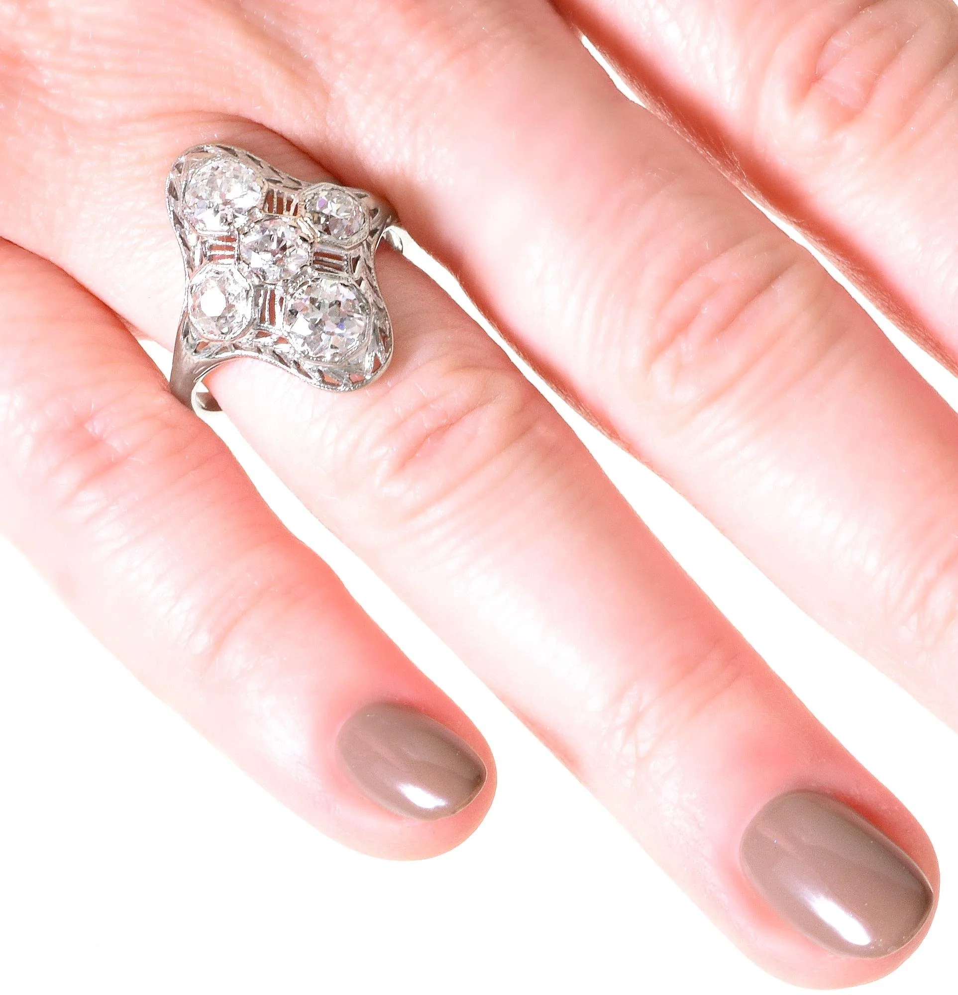 Statement making, engagement or right handed ring! This very versatile antique Art Deco diamond ring is just waiting to be fallen in love with! This one gets a lot of attention in our brick and mortar shop and with good reason. Crafted back in the 20's with both platinum and 18k white gold, there are 5 European cut diamonds totaling 2.15 carats shining from within an outstanding low profile setting. This one is meant for regular wear in our opinion and is definitely "swoon worthy"!