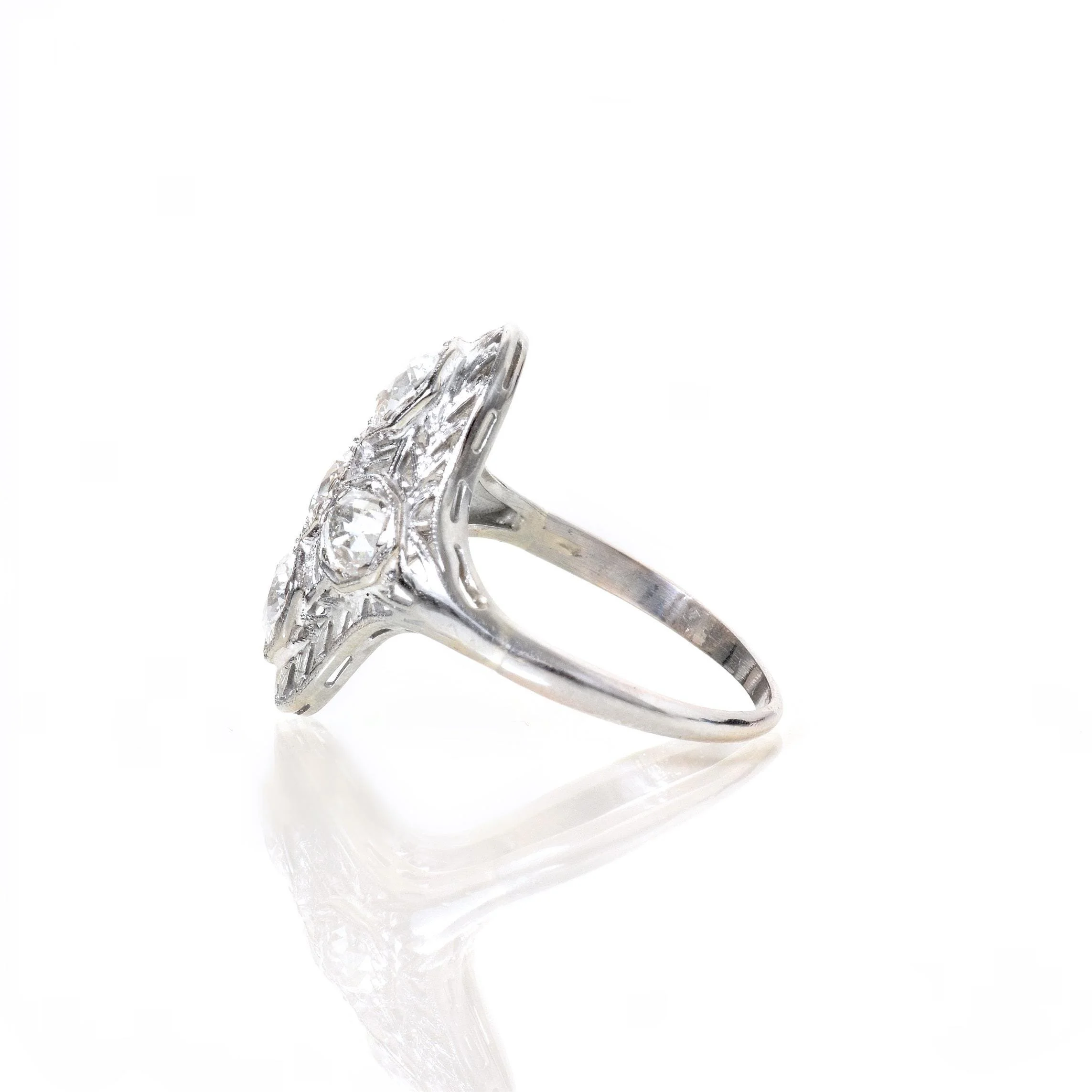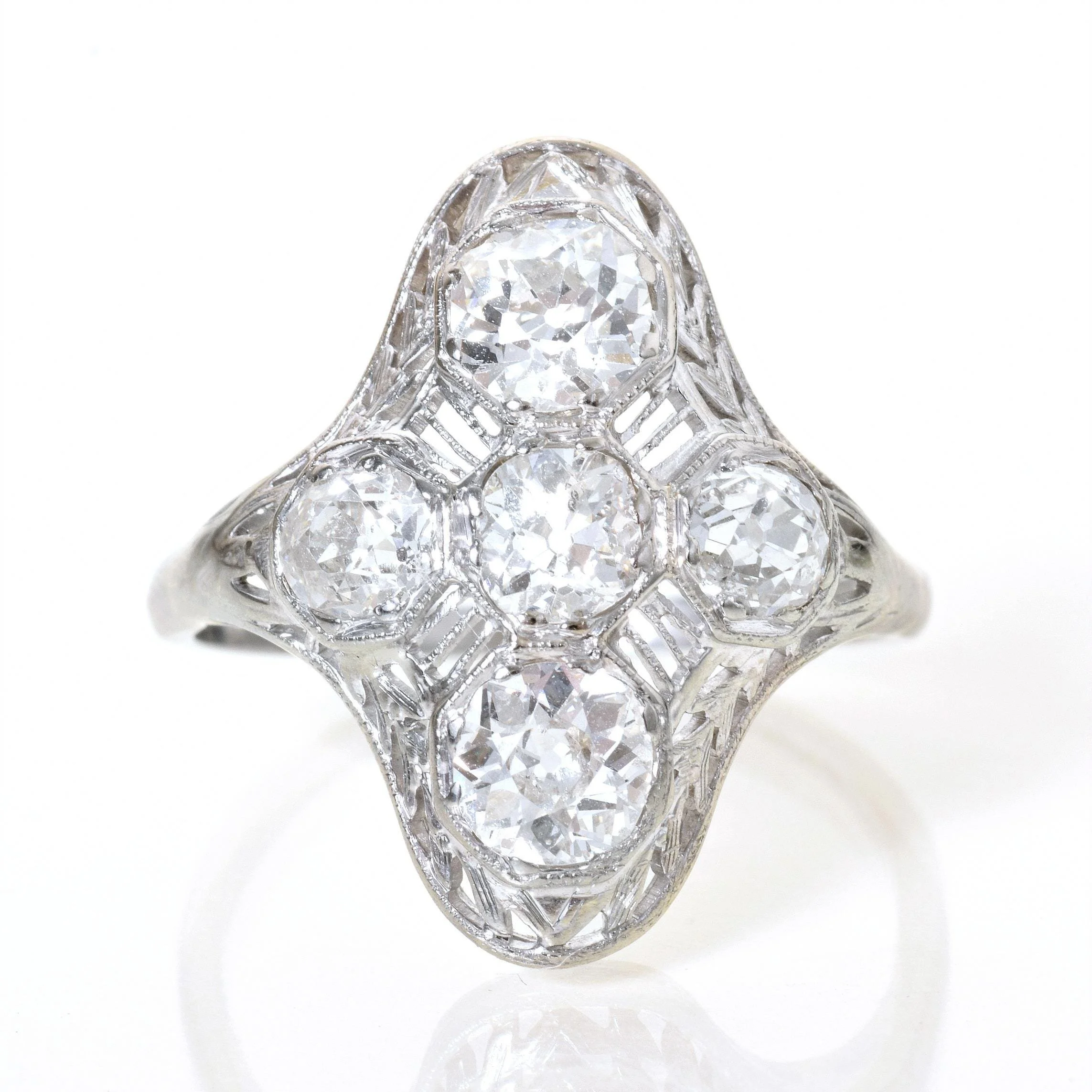 Antique Ring - Antique Art Deco Platinum/18k White Gold European Cut Diamond Ring Circa 1920's Platinum & 18k White Gold 5 European Cut Diamonds =2.15cts VS1-SI1/G-I Ring Size 7.75 (ring is sizable) Ring measures approximately 21.5mm tall at center, back of band is 1.6mm wide.