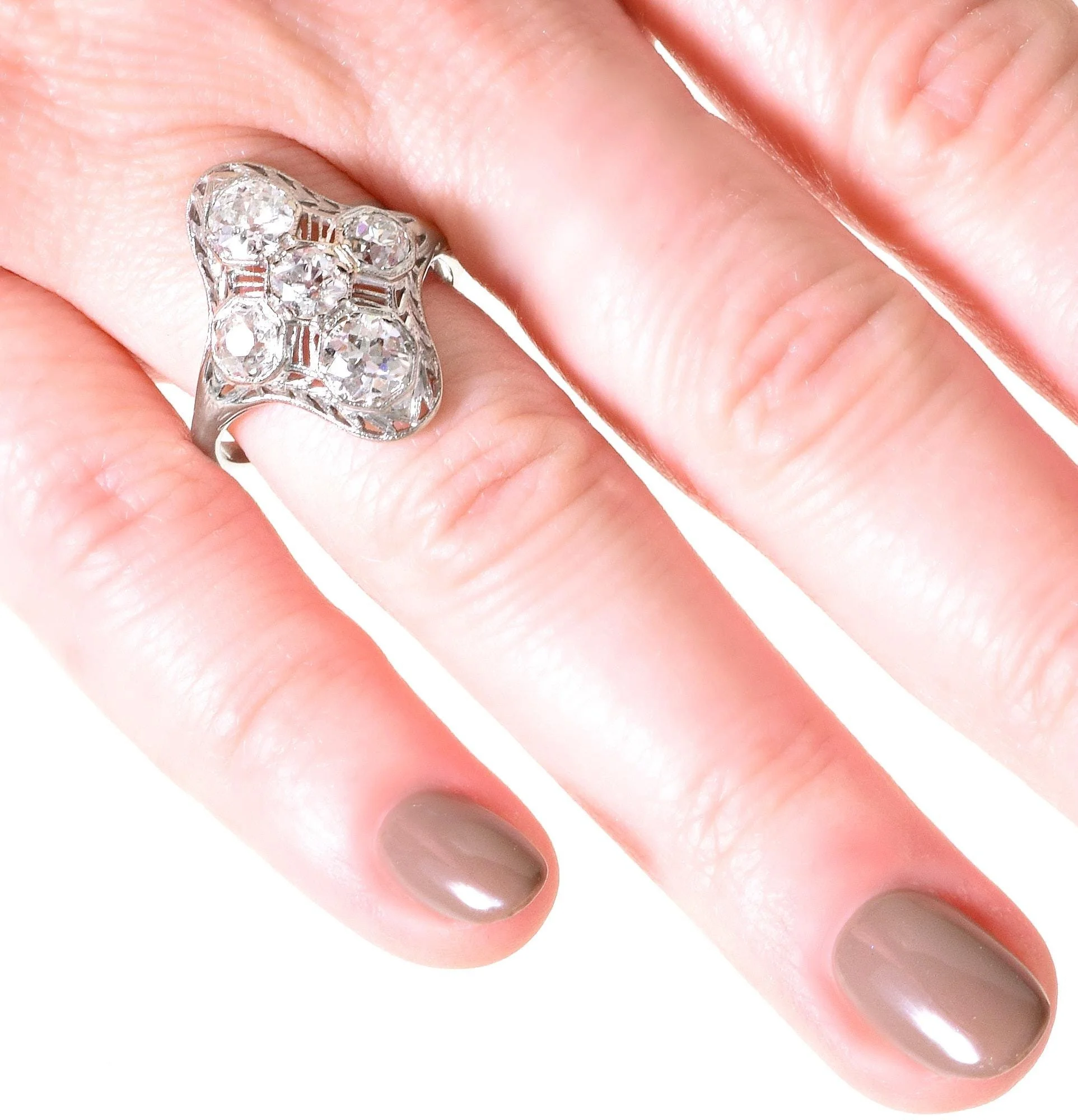 Statement making, engagement or right handed ring! This very versatile antique Art Deco diamond ring is just waiting to be fallen in love with! This one gets a lot of attention in our brick and mortar shop and with good reason. Crafted back in the 20's with both platinum and 18k white gold, there are 5 European cut diamonds totaling 2.15 carats shining from within an outstanding low profile setting. This one is meant for regular wear in our opinion and is definitely "swoon worthy"!