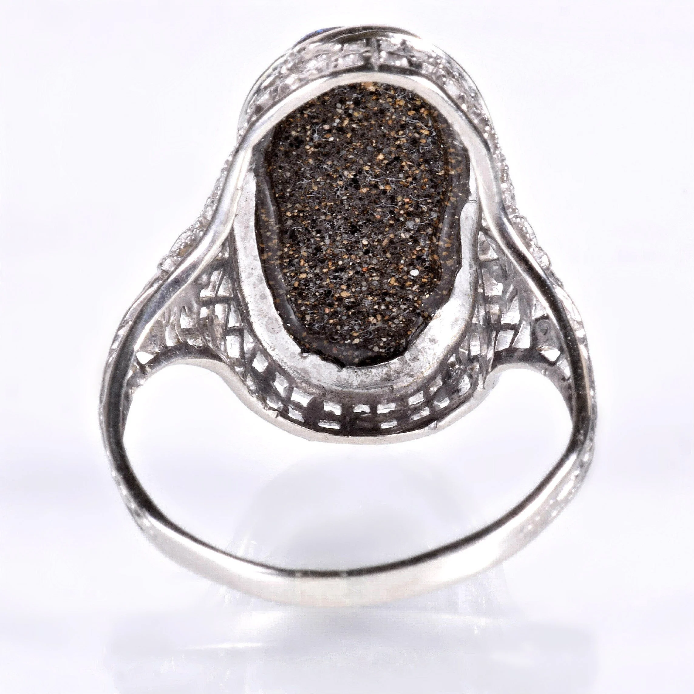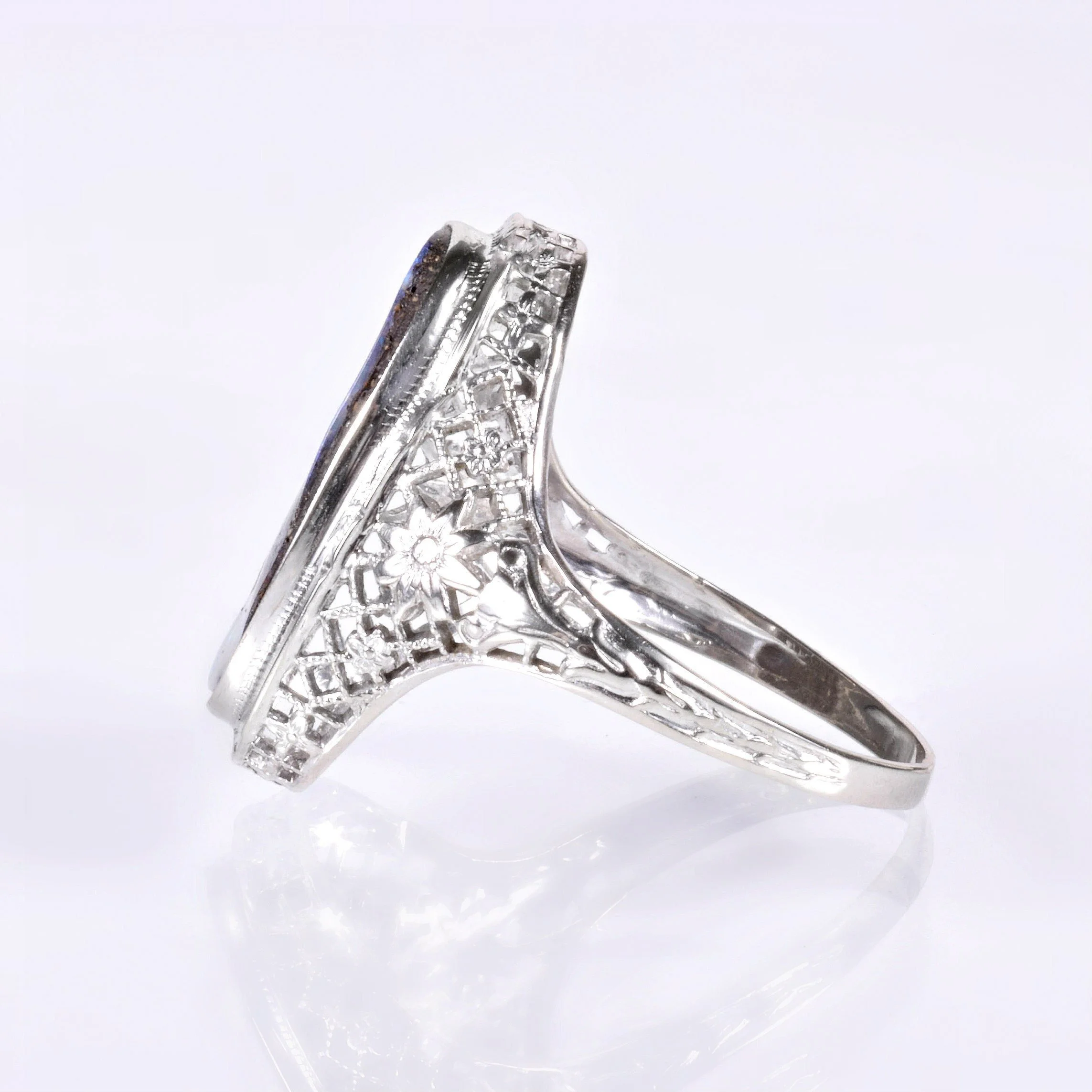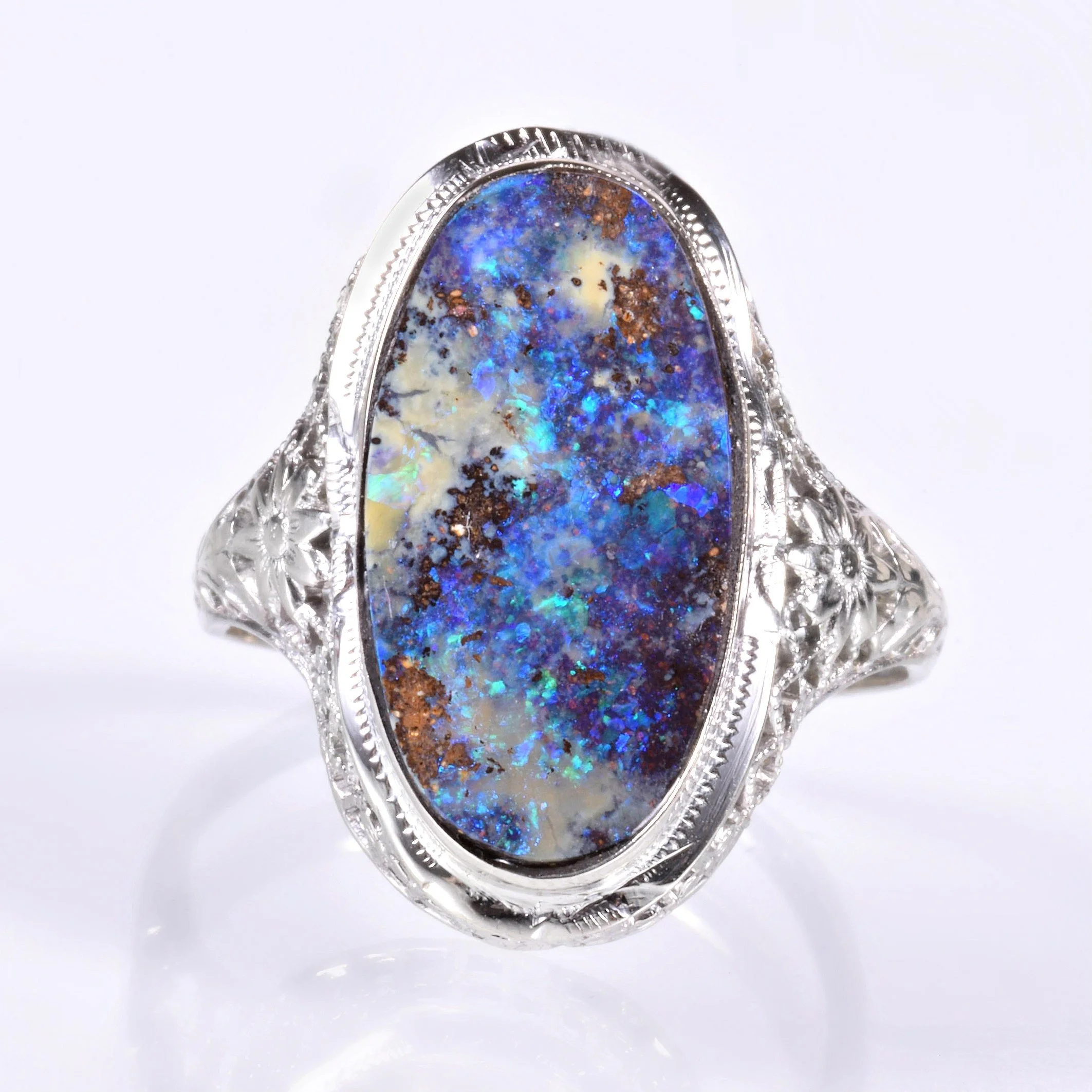 Set in an engraved bezel, those of us in the jewelry business have always known that this oval shape tends to elongate the finger. We love and admire the boulder opal in our shop and we really enjoy pairing this magnificent gemstone with our antique mountings whenever it makes sense. In yet another case.... a marriage made in heaven! So many crisp details are on display in this romantic 14k white gold setting. Floral engraving and open wire work set the perfect stage for such a stunning antique ring holding an equally stunning and interesting gemstone.