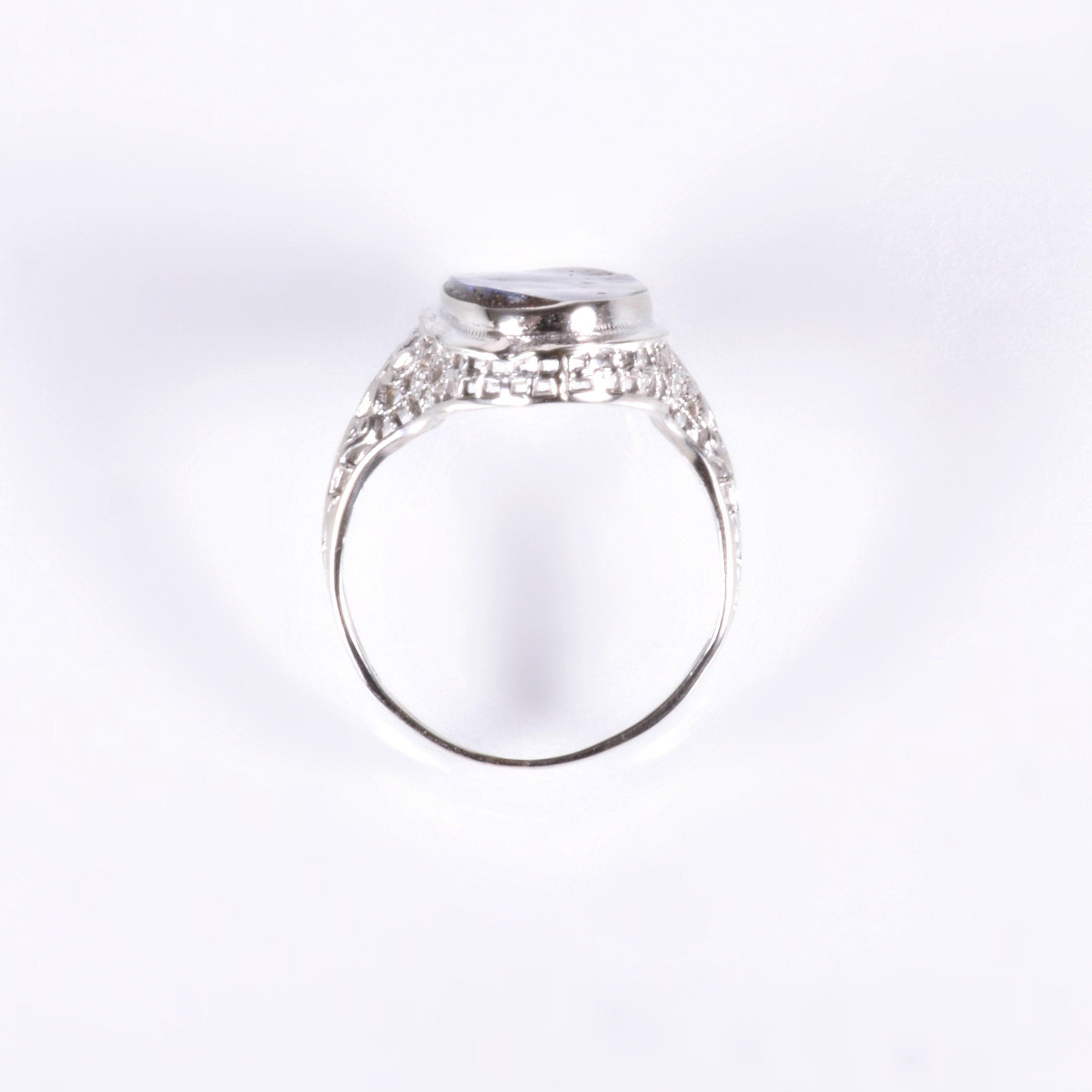 Set in an engraved bezel, those of us in the jewelry business have always known that this oval shape tends to elongate the finger. We love and admire the boulder opal in our shop and we really enjoy pairing this magnificent gemstone with our antique mountings whenever it makes sense. In yet another case.... a marriage made in heaven! So many crisp details are on display in this romantic 14k white gold setting. Floral engraving and open wire work set the perfect stage for such a stunning antique ring holding an equally stunning and interesting gemstone.