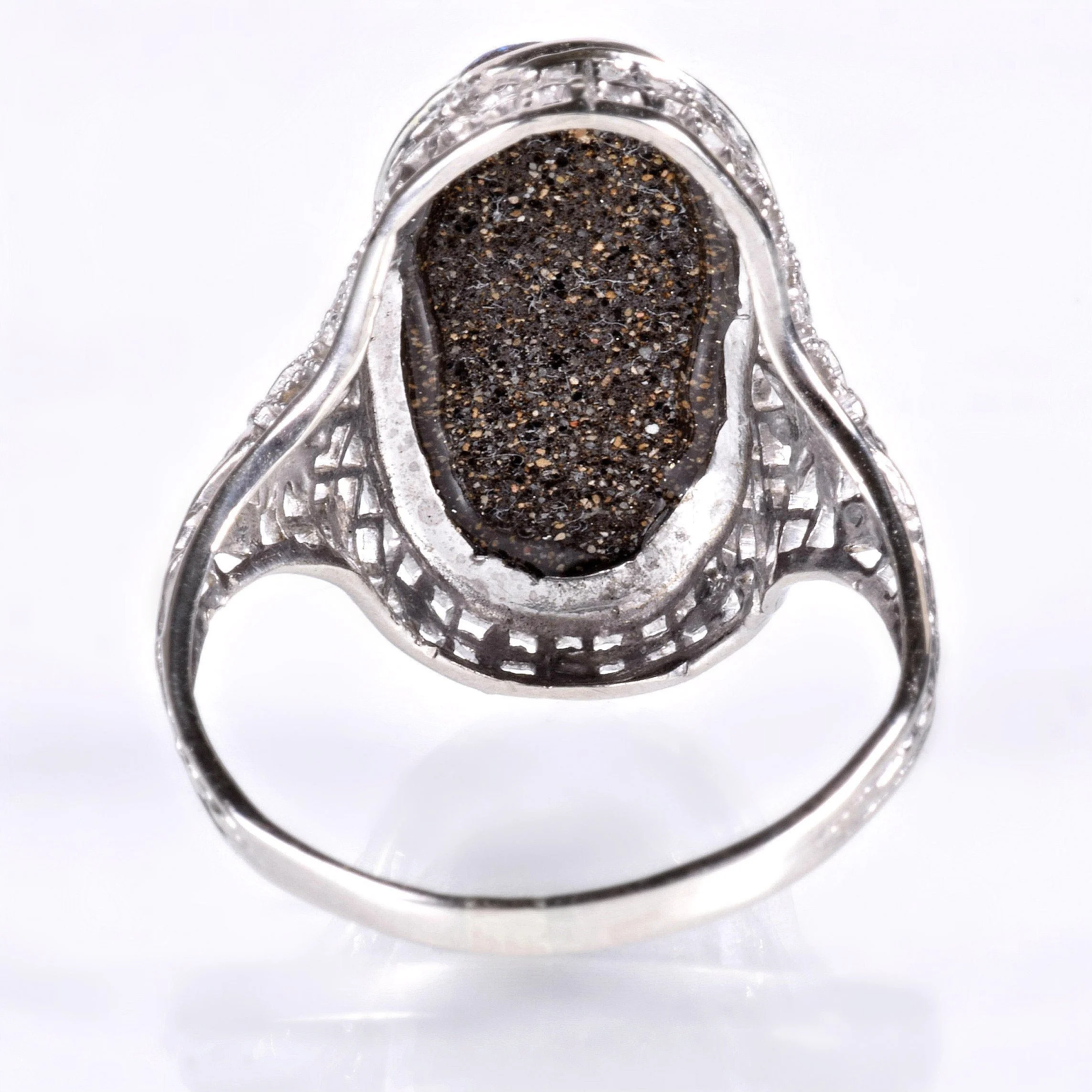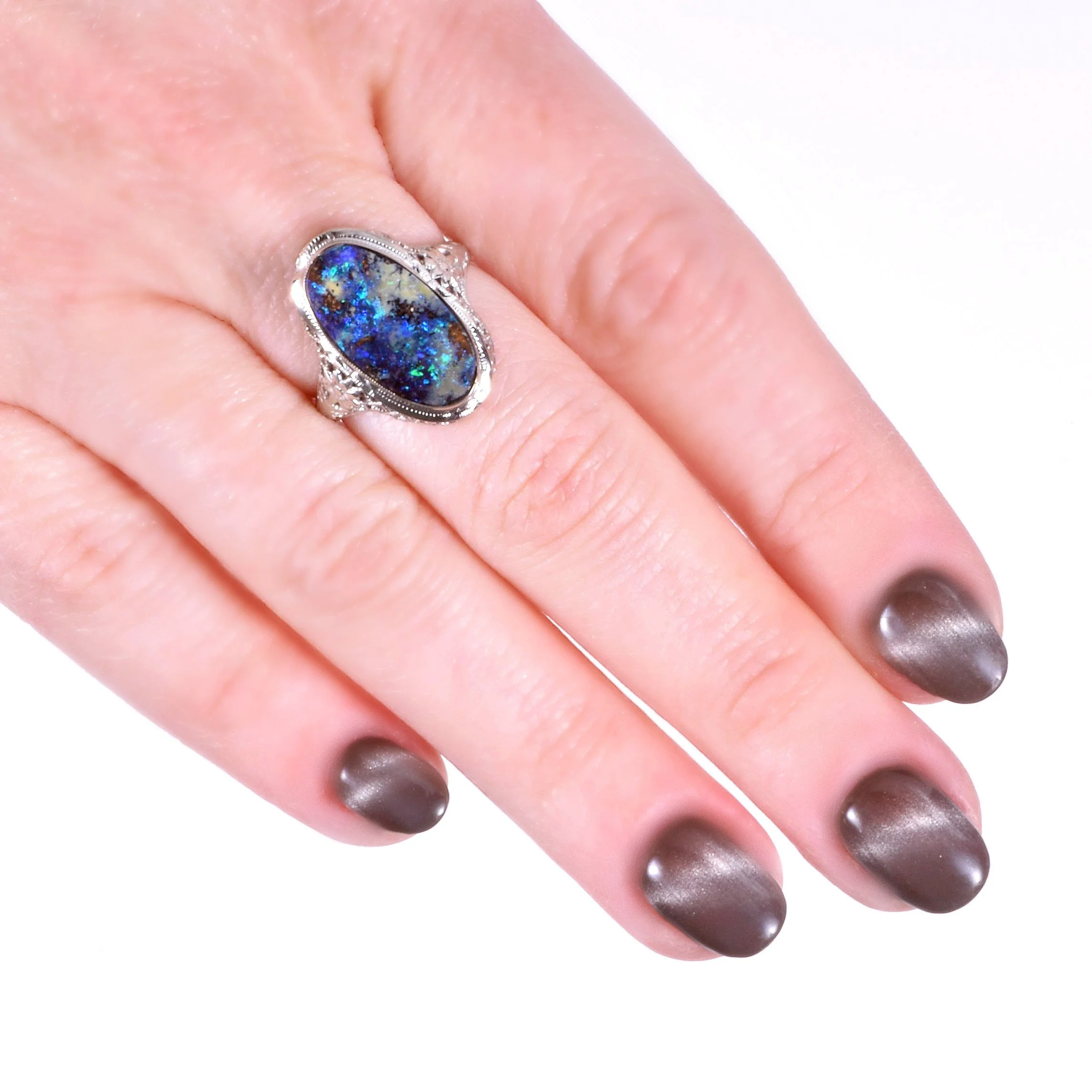 Set in an engraved bezel, those of us in the jewelry business have always known that this oval shape tends to elongate the finger. We love and admire the boulder opal in our shop and we really enjoy pairing this magnificent gemstone with our antique mountings whenever it makes sense. In yet another case.... a marriage made in heaven! So many crisp details are on display in this romantic 14k white gold setting. Floral engraving and open wire work set the perfect stage for such a stunning antique ring holding an equally stunning and interesting gemstone.
