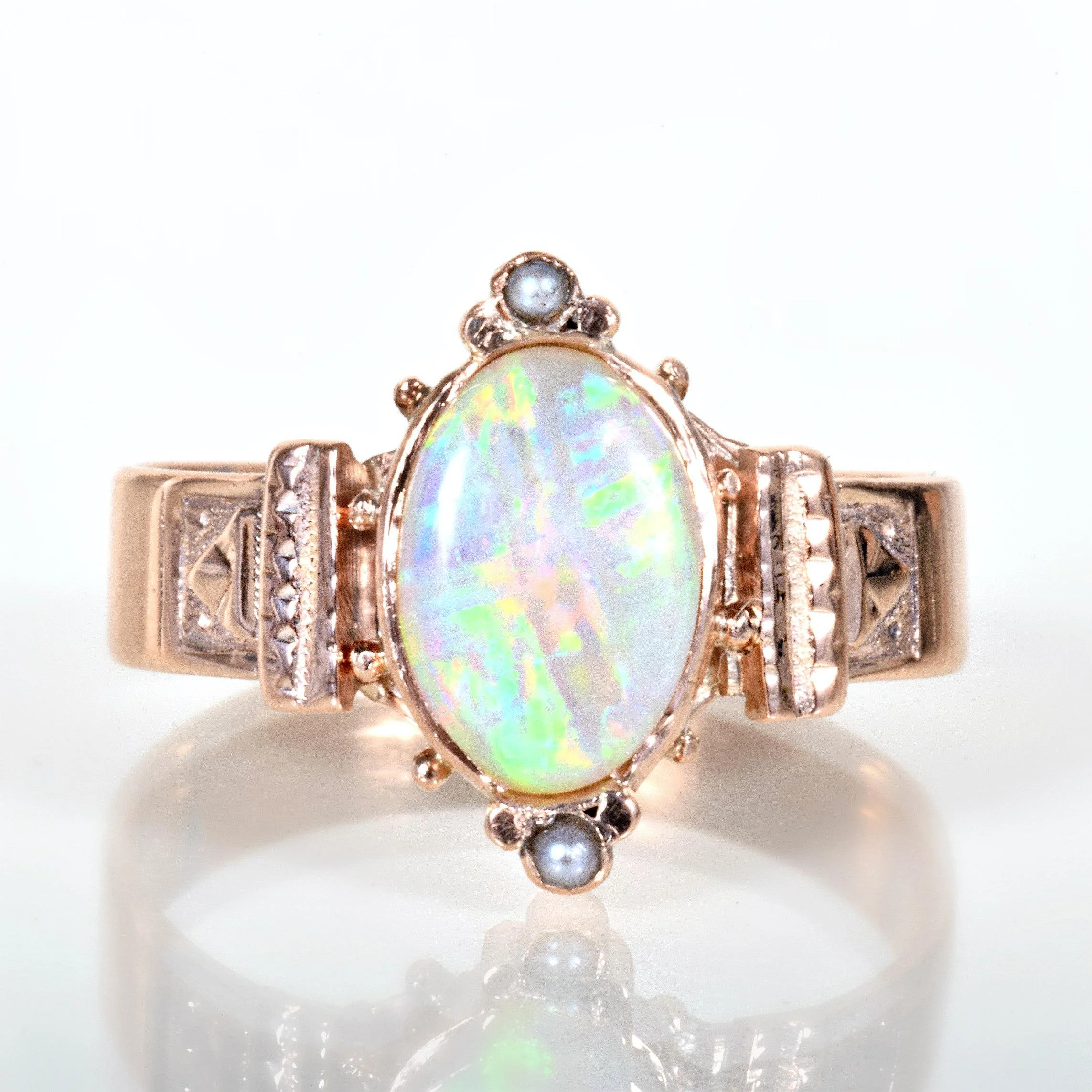Antique Ring - Antique Victorian 14k Rose Gold Opal & Seed Pearl Ring