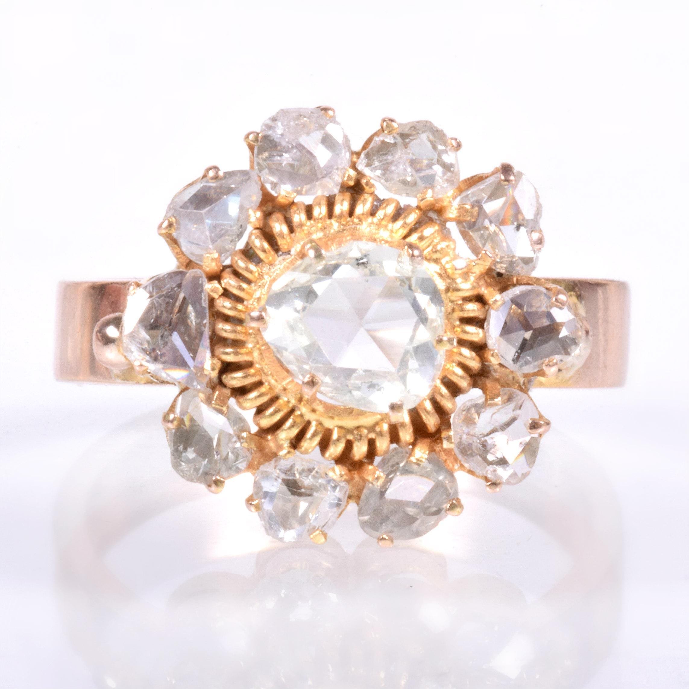 Antique Ring - Antique Victorian 18k Yellow Gold Rose Cut Diamond Flower Conversion Ring Victorian 18k Yellow Gold 11 Rose Cut Diamonds =1.23cts SI1-I1/H-J Ring Size 7.75 (sizable) Ring measures approximately 15mm wide at center, back of band is 3.7mm wide.