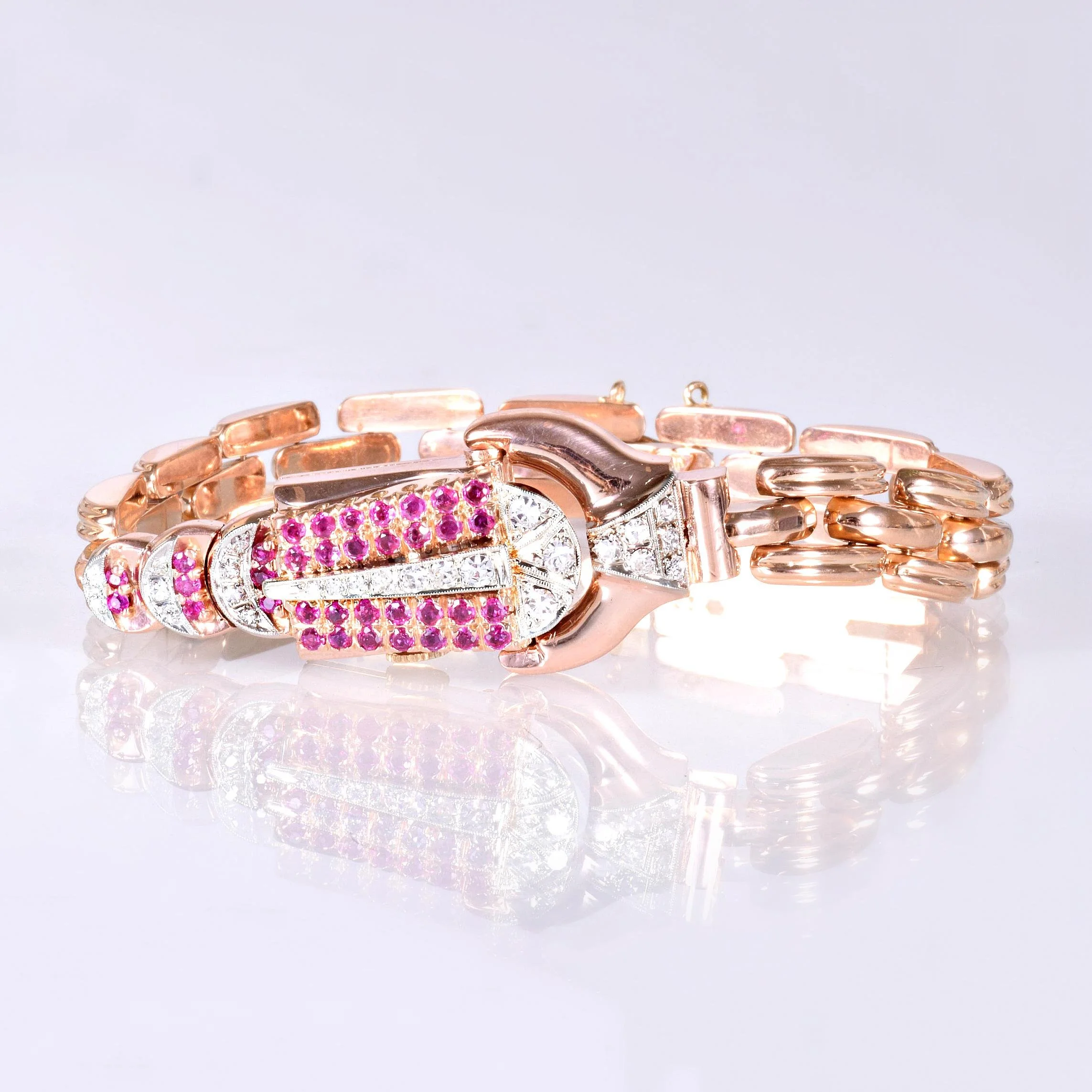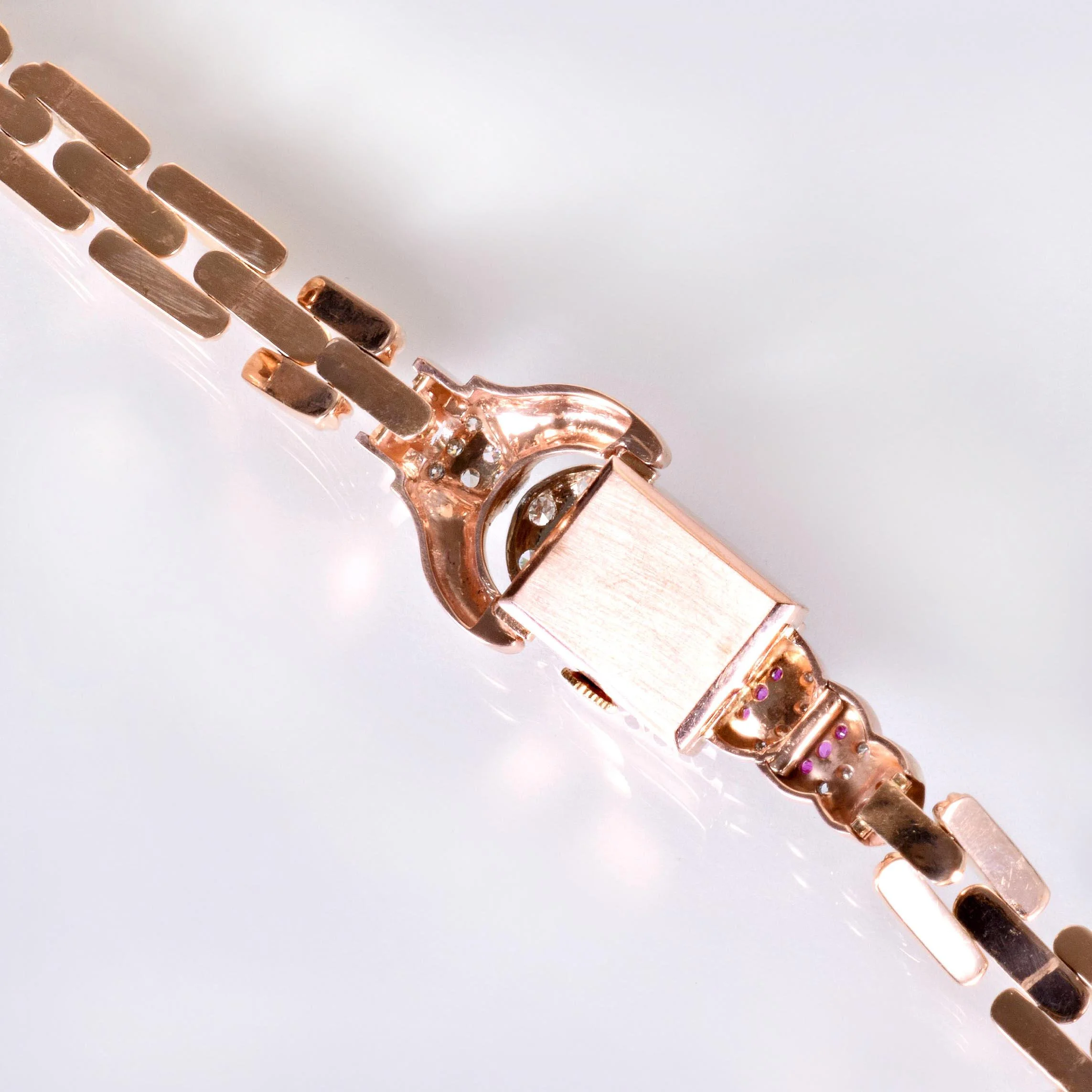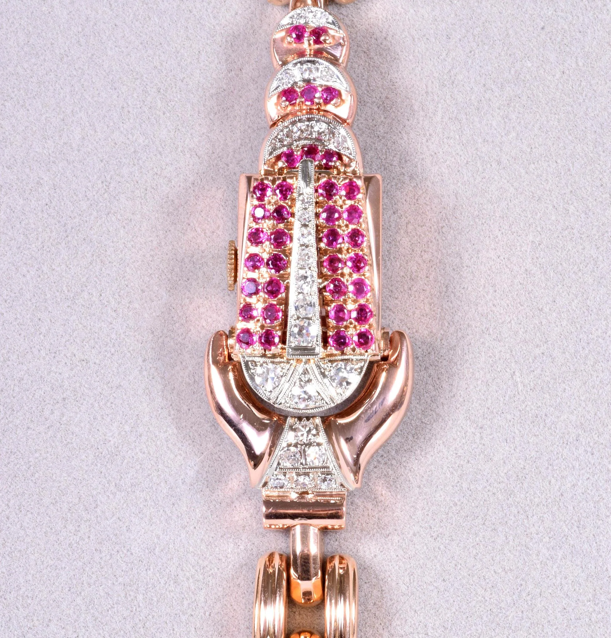 Antique Watch - Antique Retro 1930's 18k Rose Gold Ladies Diamond & Ruby Wrist Watch 18k Rose Gold Retro 1930's 25 European and Single Cut Diamonds =.50ct VS-SI1/G-I 36 Rubies =.54ct Zodiac Movement Entire length of watch measures approximately 7.75" long.