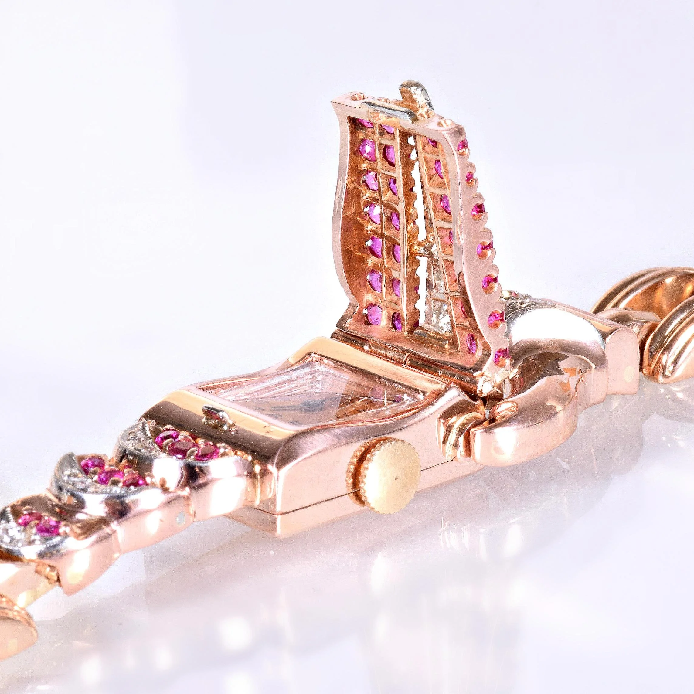 This Retro 1930's Diamond and 18k Rose Gold Ladies Dress Watch is in excellent condition and would be a lovely Retro accent piece to anyone's jewelry collection. With 36 Rubies and 25 European cut Diamonds showcasing the watch face cover of this beautiful time piece, it is surely a showstopper. Can be worn as a bracelet alone with it's hidden watch face. Unique and gorgeous as you are. A true treasure!