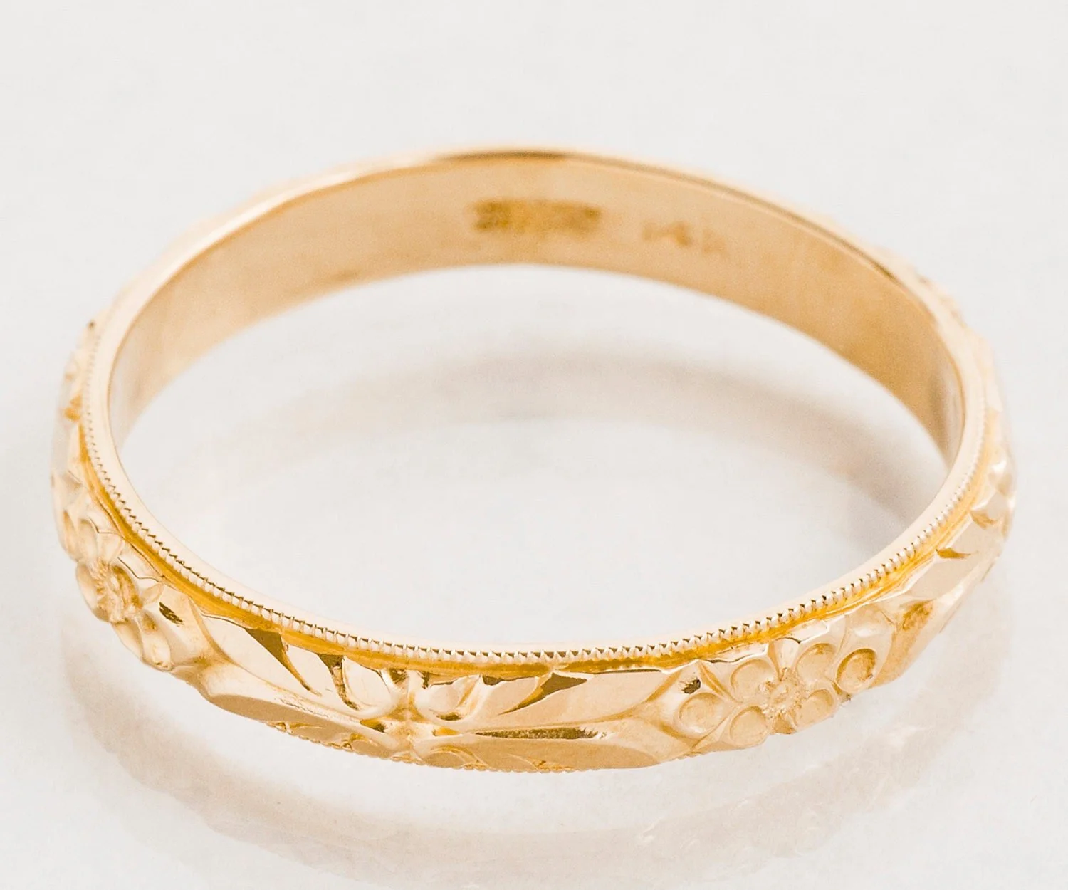 Crisp and clean etching and milgrain surrounds this larger sized antique wedding band. We have it listed as a men's band, but certainly can be worn by either a man or woman. Could be the perfect choice for the groom who wishes to have a band on the thinner side. We do have a matching band in a smaller size as well. In rich rose gold, this is yet another fine example from our antique band collection!
