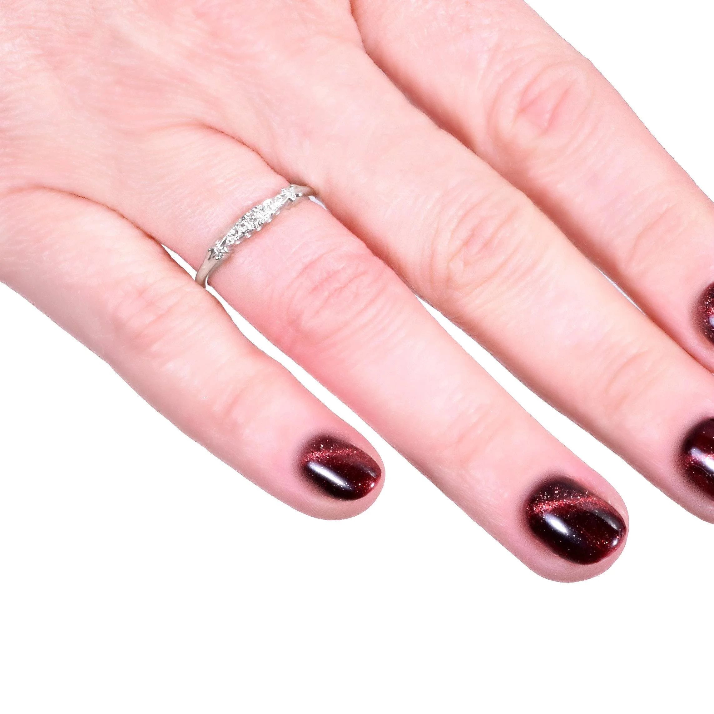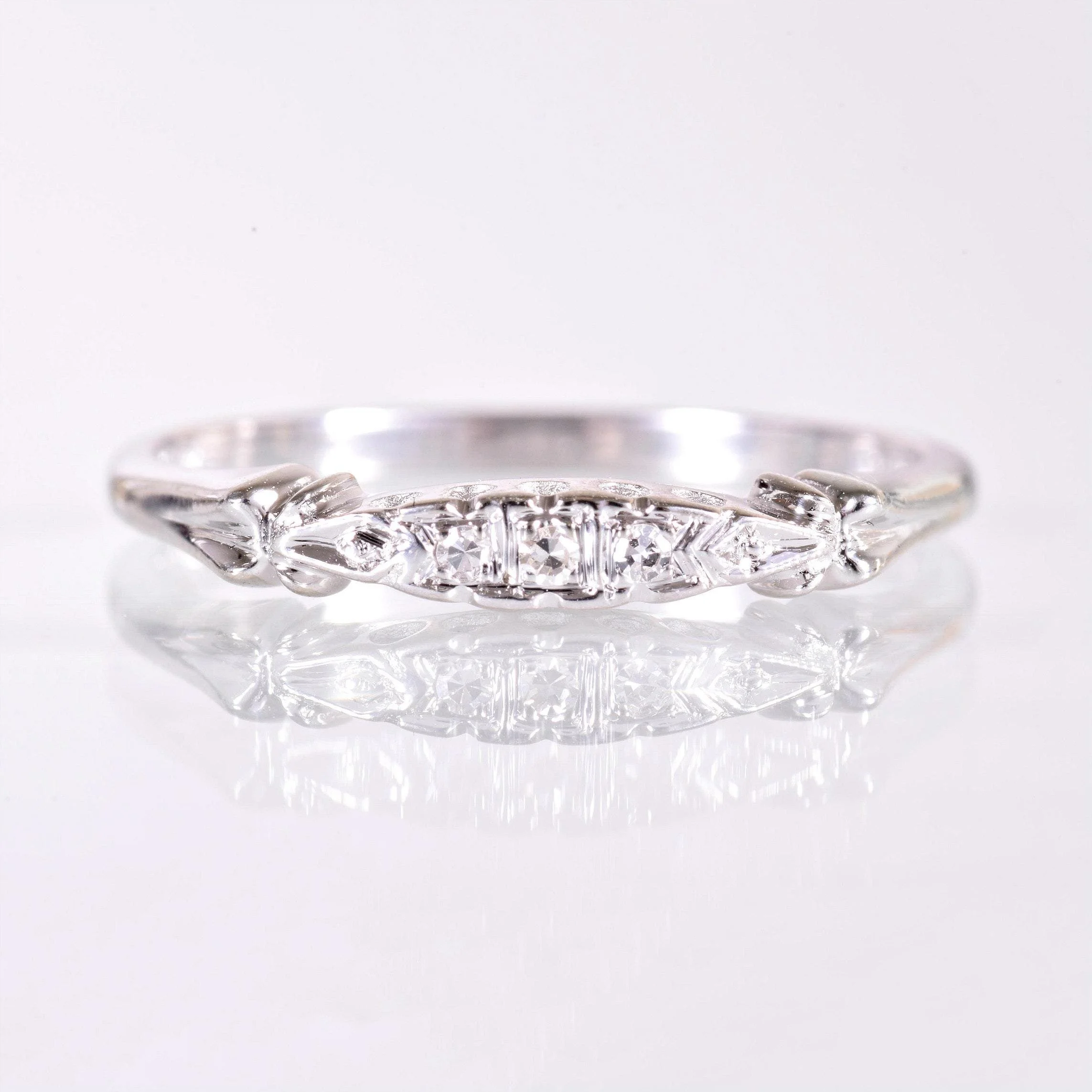 She's a lil curvy but that's what makes her special! This antique diamond wedding band shows off 3 tiny sparkling diamonds adding so much allure. Crafted in 14k white gold, back in the 1920's-1930's. Wear this little beauty on its own or alongside your engagement ring of any era.