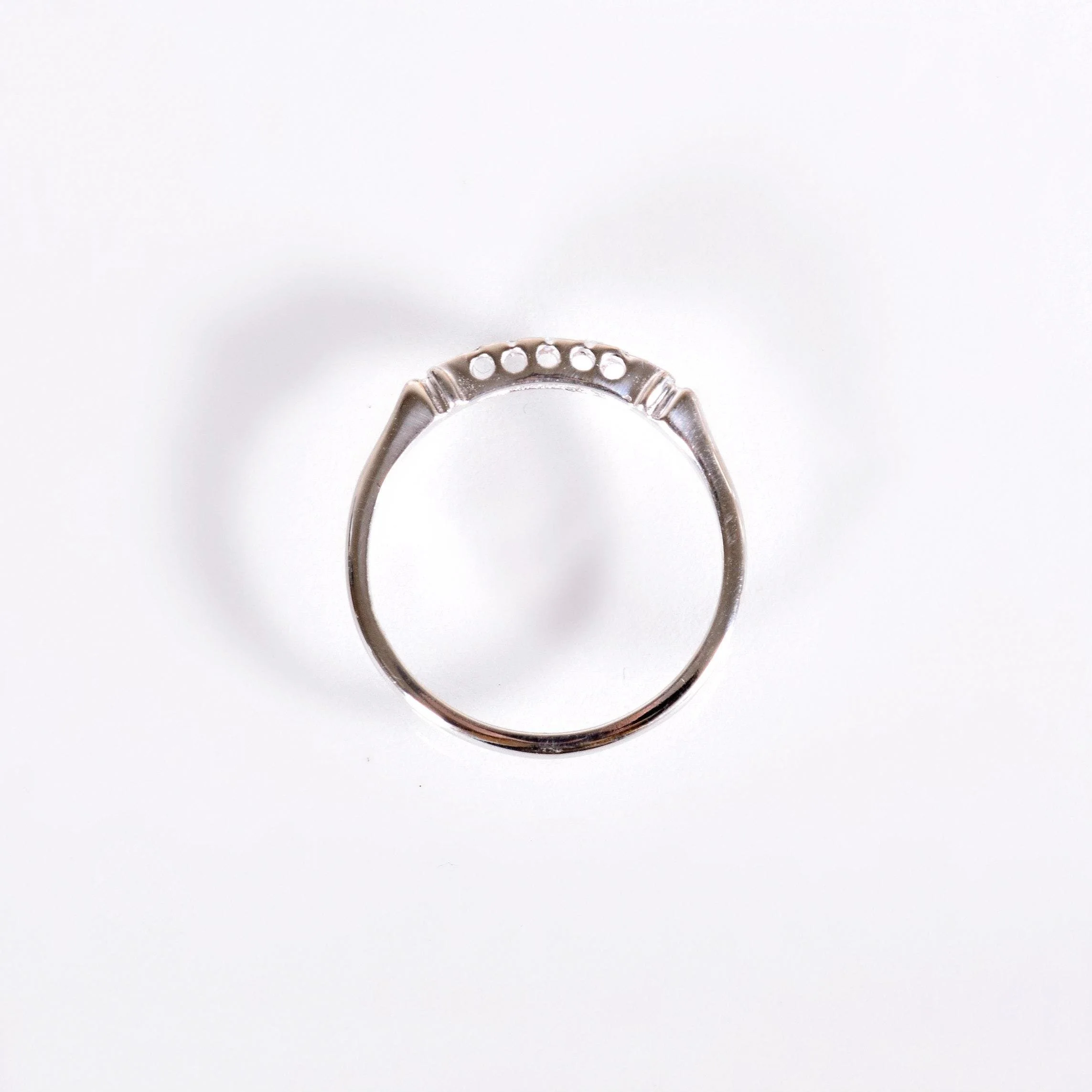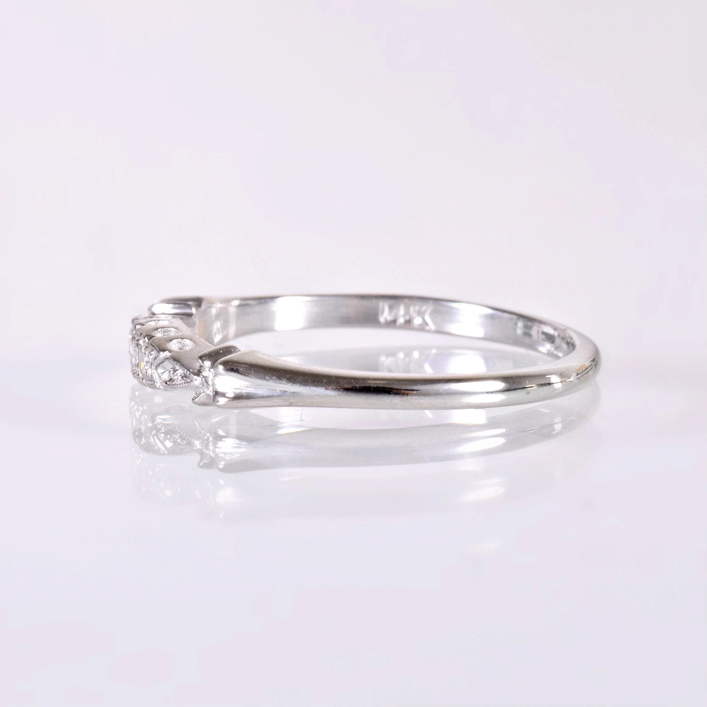 Antique Wedding Band - Antique 14k White Gold Diamond Wedding Band Circa 1920's-30's 14k White Gold 3 Single Cut Diamonds =.05ct Ring Size 5.25 (sizable) Ring measures approximately 2.7mm at center, back of band is 1.5mm wide.