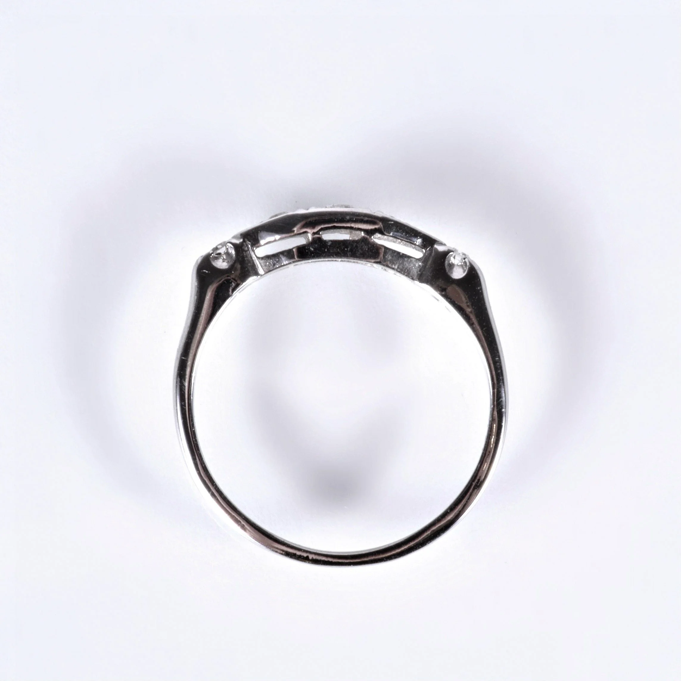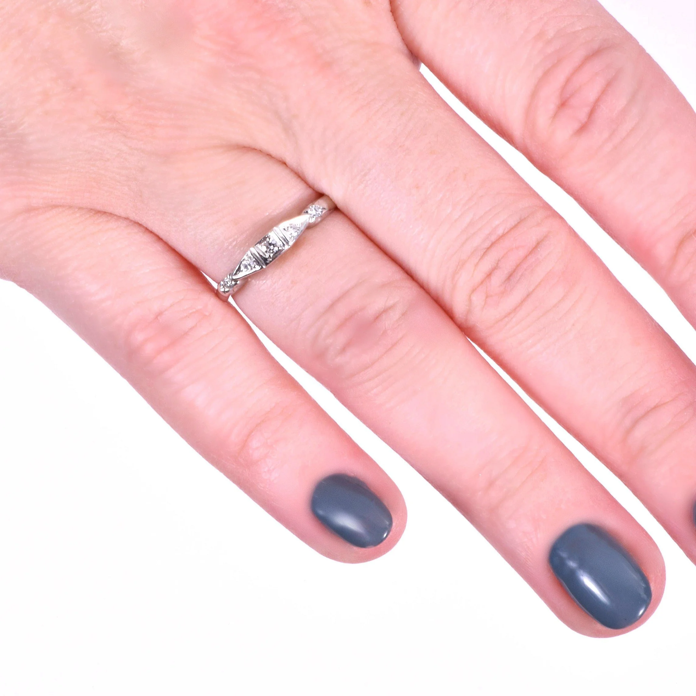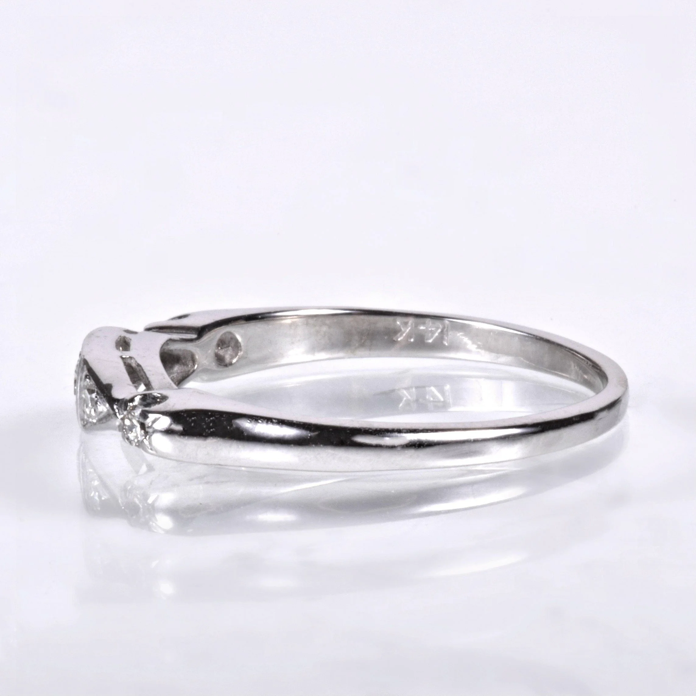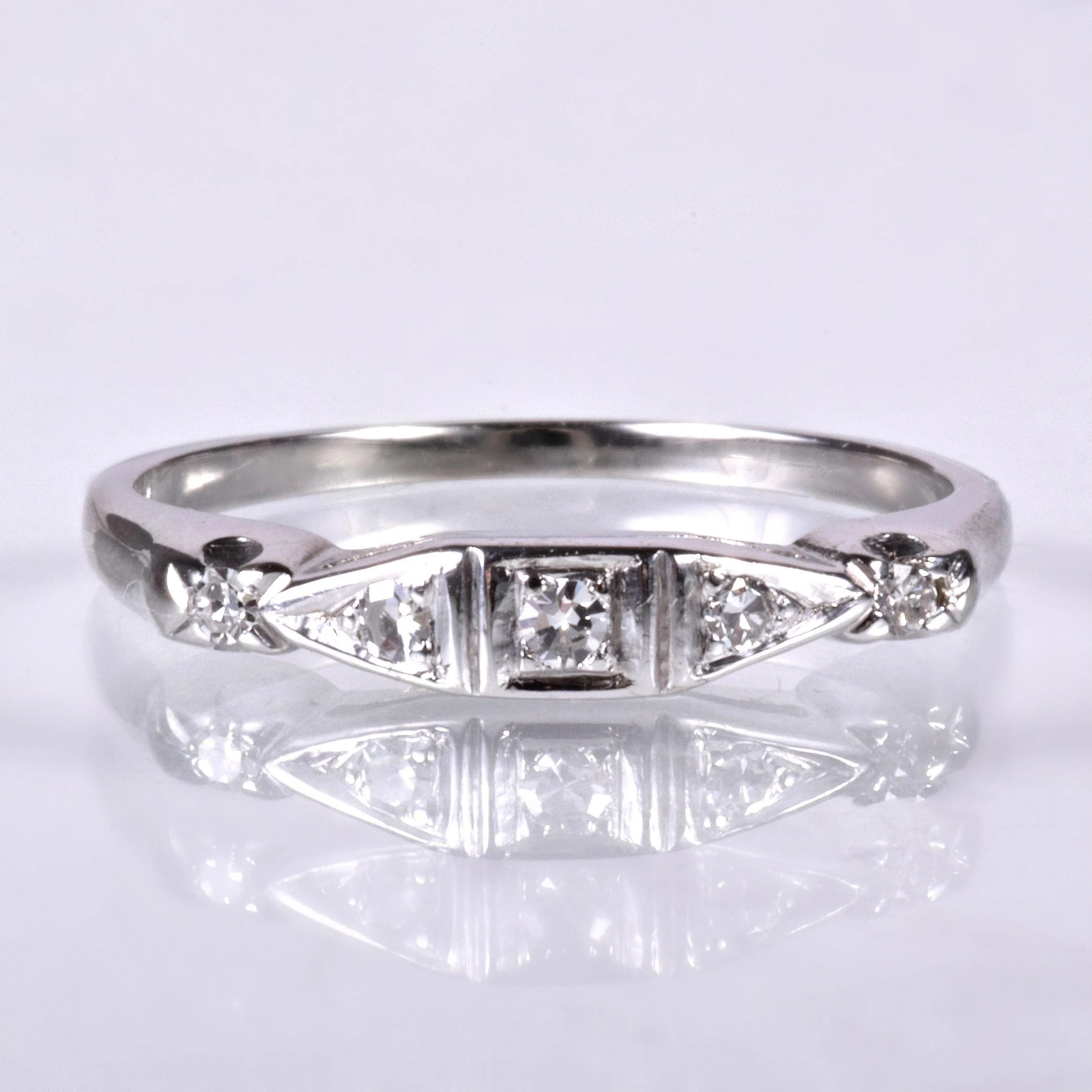 They may be tiny, but they pack a lot of sparkle! Five shimmering diamonds are showcased in this sweet, full of character 14k white gold antique diamond wedding band. Pair it up with your engagement ring of any era, wear it alone, on the right or left hand or add it to your personal and eclectic stacking combination!