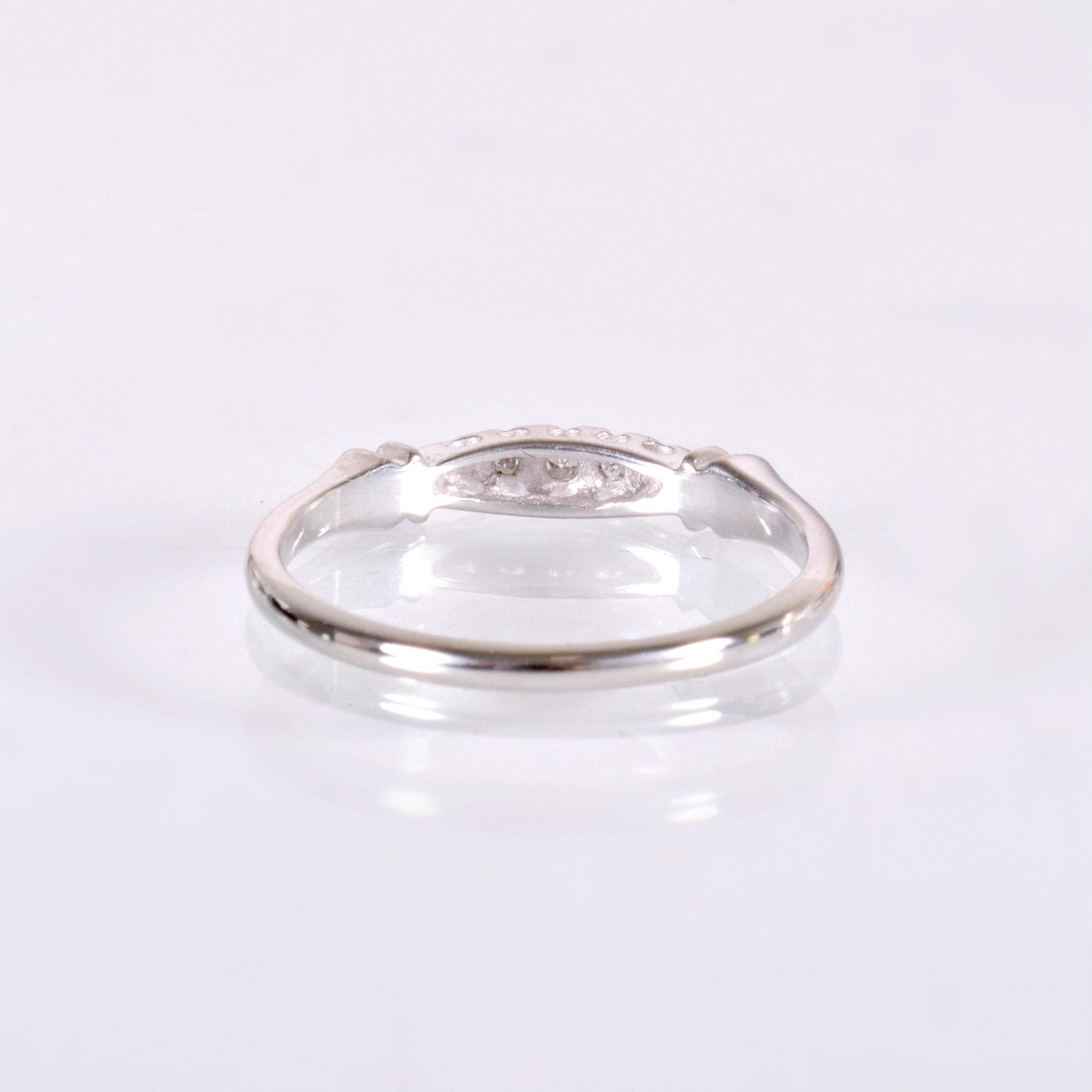 She's a lil curvy but that's what makes her special! This antique diamond wedding band shows off 3 tiny sparkling diamonds adding so much allure. Crafted in 14k white gold, back in the 1920's-1930's. Wear this little beauty on its own or alongside your engagement ring of any era.