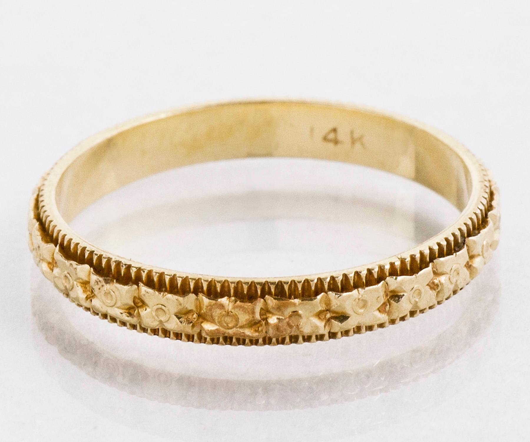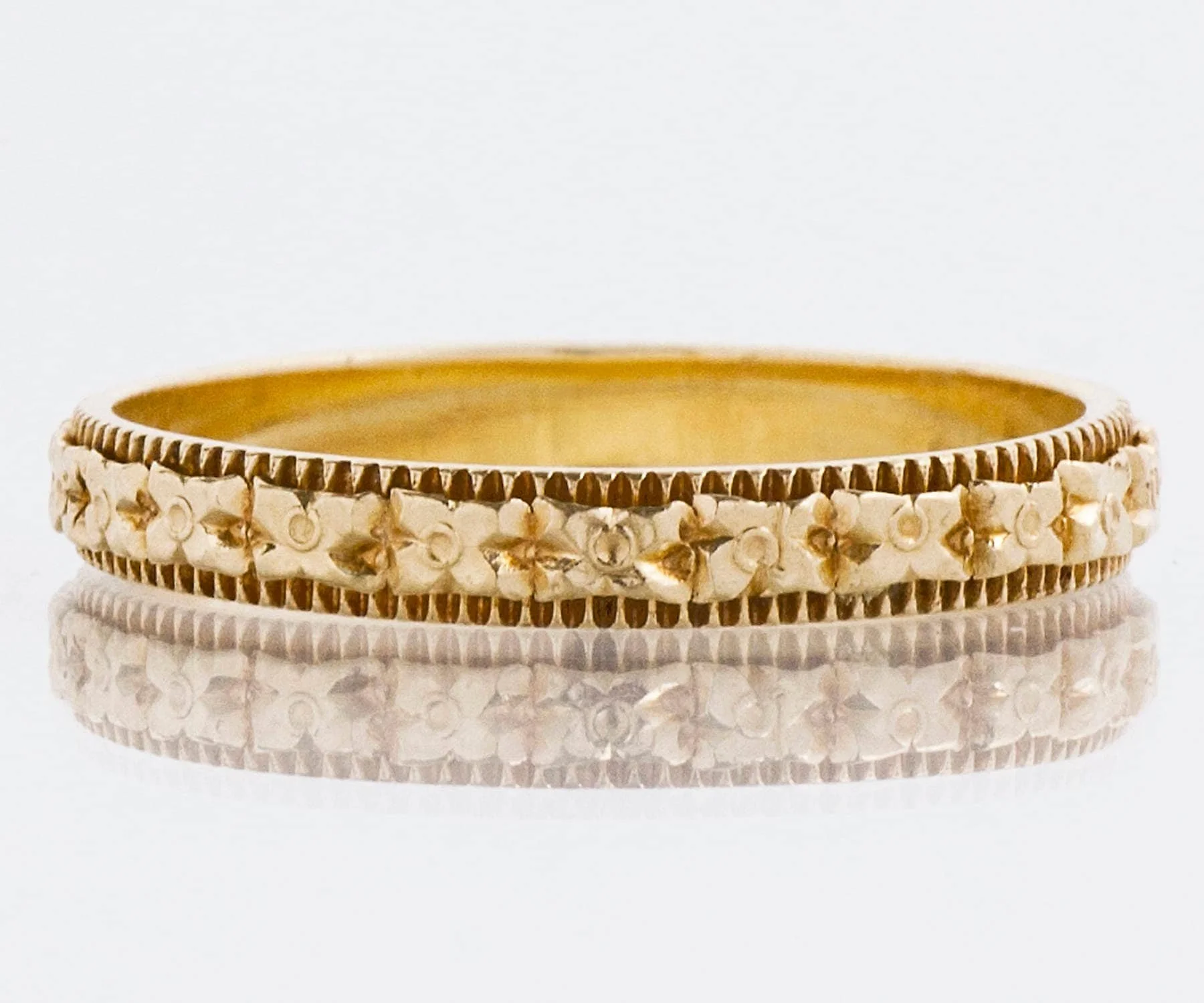 It doesn't get any crisper than this! An eternity pattern of romantic blossoms surrounds this milgrain edged antique wedding band in 14 k yellow gold. In remarkable condition for it's very advanced age. Wear it as your wedding band, right-handed ring or as part of your eclectic stackable combination!