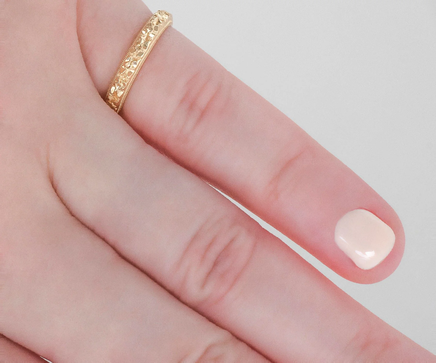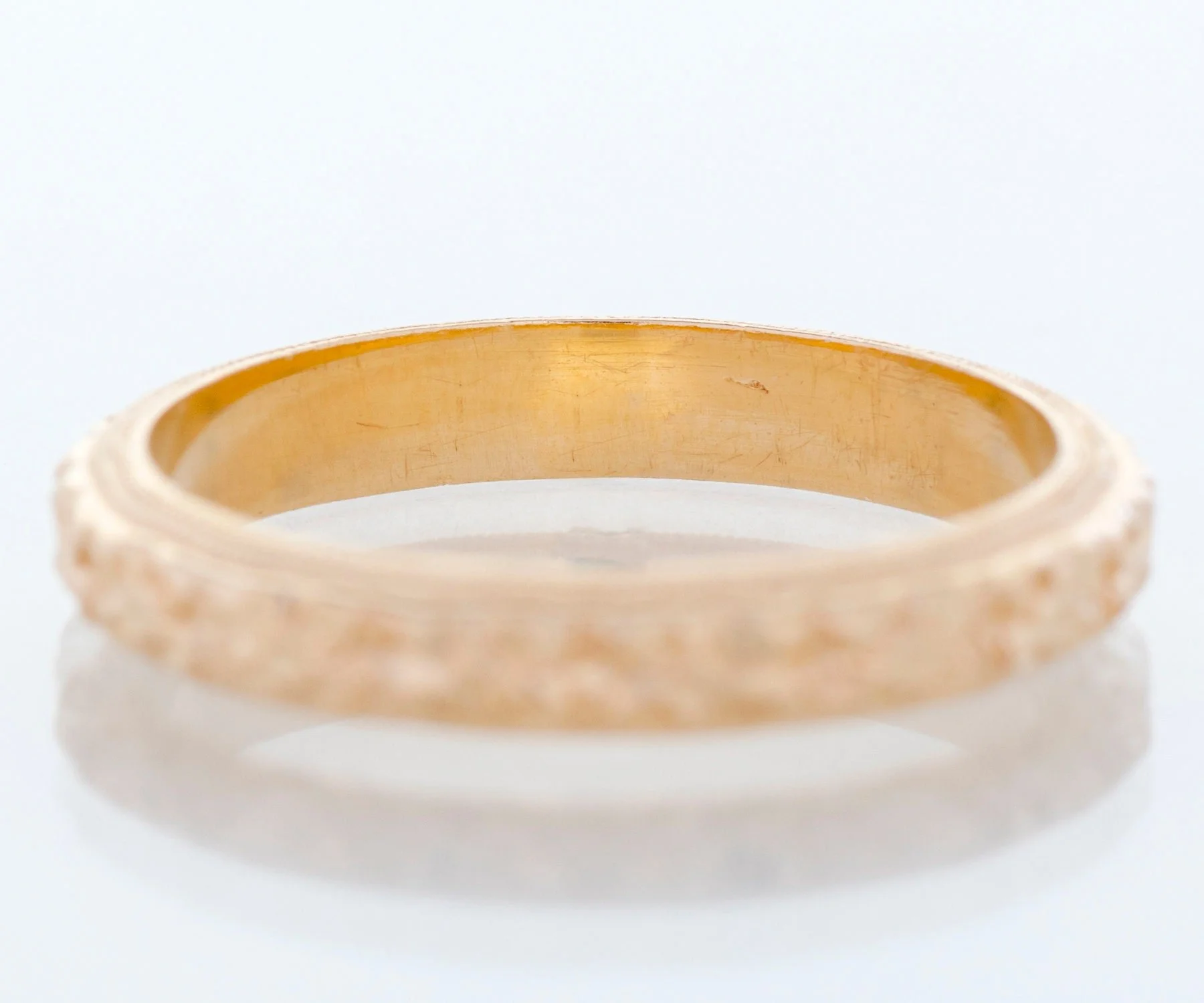 We are pleased to offer this lovely blossom filled antique wedding band which we acquired as "new old stock" This means that the piece was never sold at retail but was created many years ago, not reproduced. A true antique as all of our other wedding bands. Created in bright yellow gold with crisp migrain work. This beauty will look amazing alongside your engagement ring of any era, by itself or as part of your personal stacking combination.