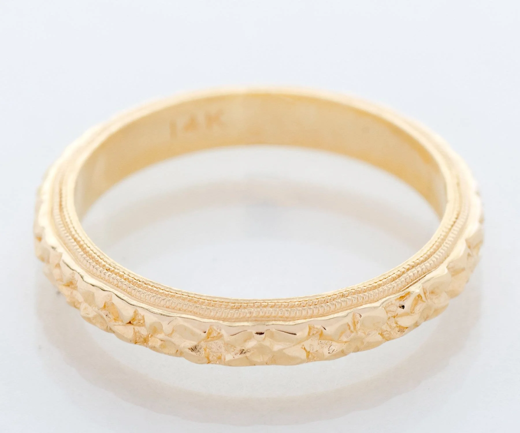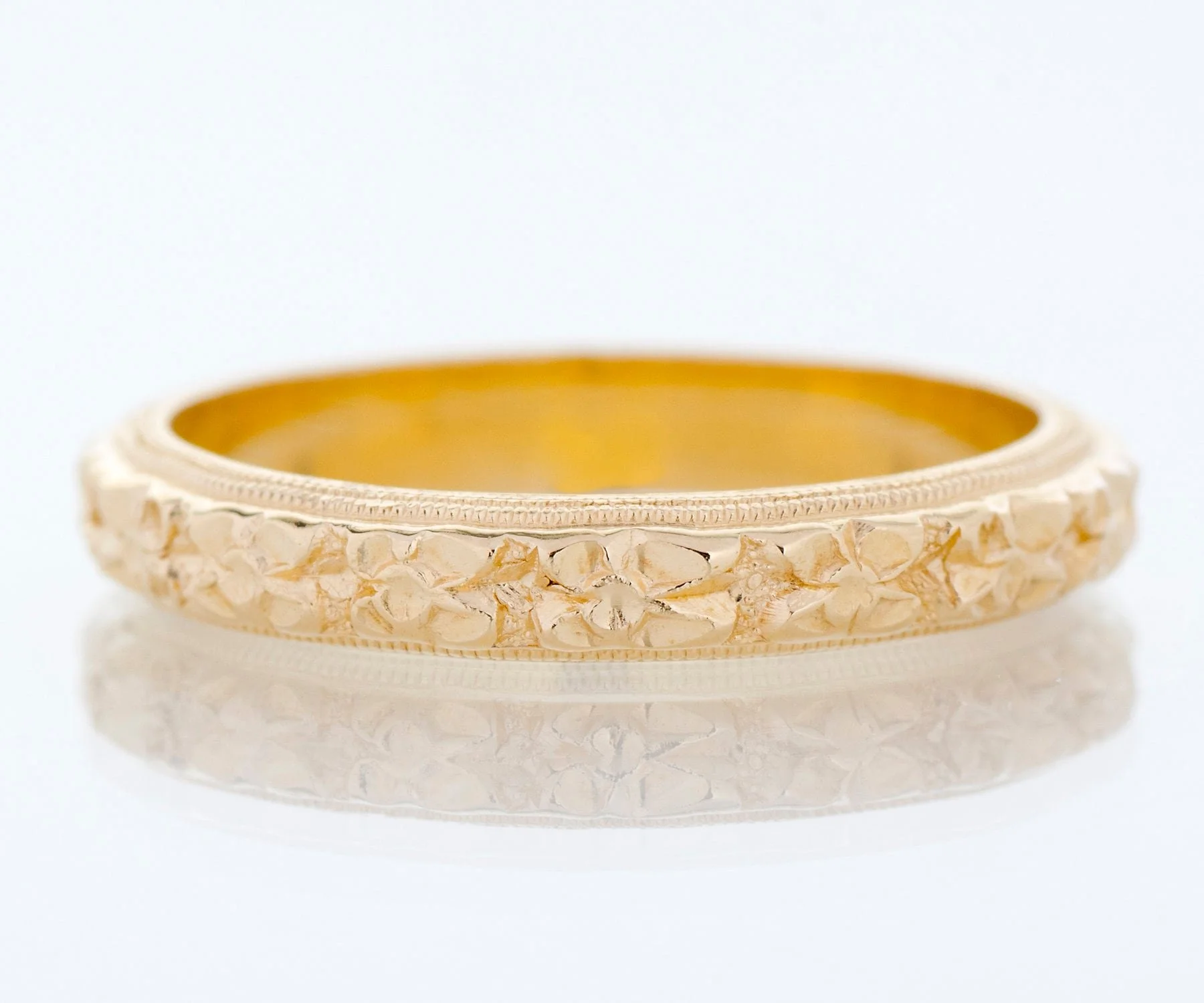 We are pleased to offer this lovely blossom filled antique wedding band which we acquired as "new old stock" This means that the piece was never sold at retail but was created many years ago, not reproduced. A true antique as all of our other wedding bands. Created in bright yellow gold with crisp migrain work. This beauty will look amazing alongside your engagement ring of any era, by itself or as part of your personal stacking combination.