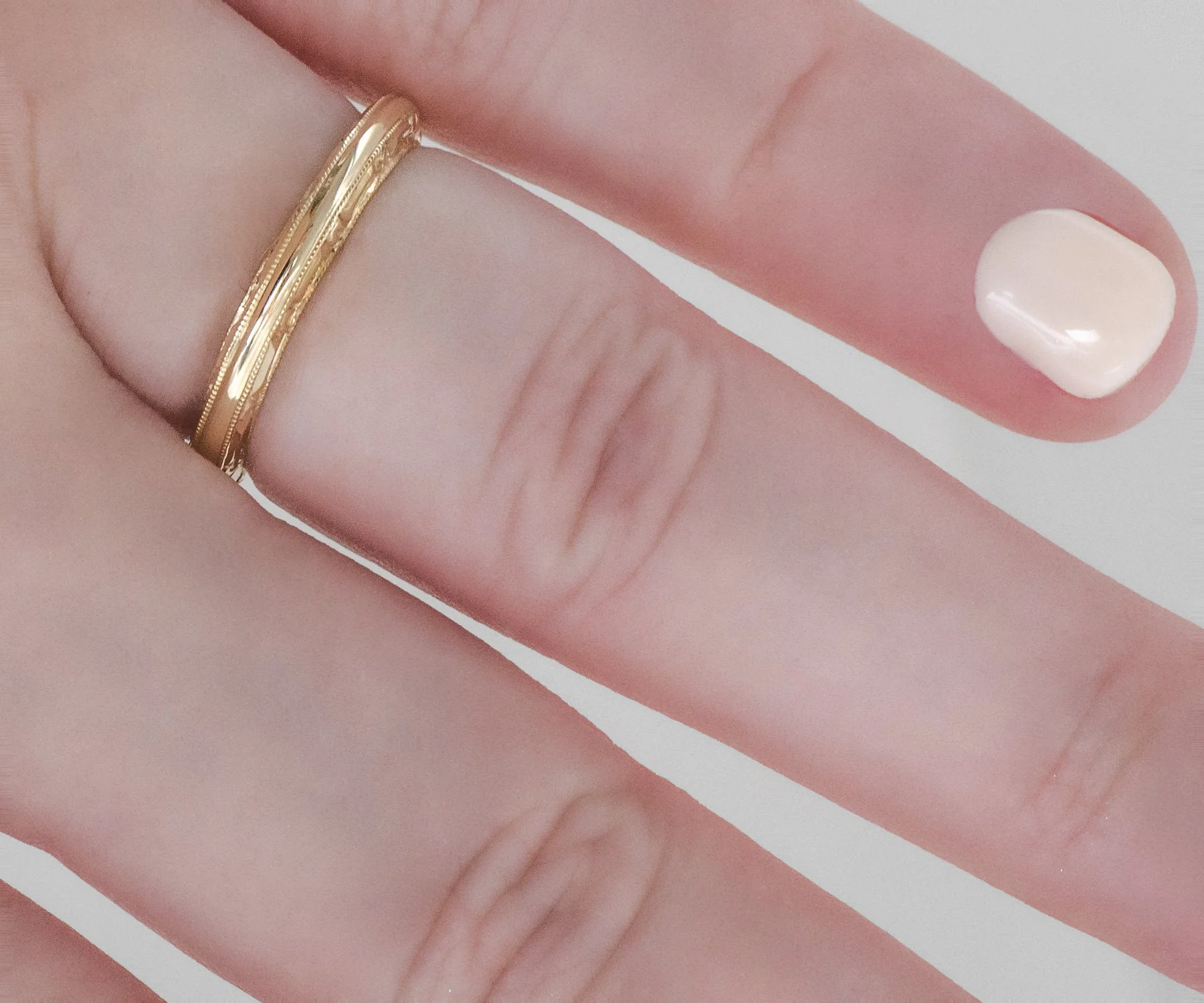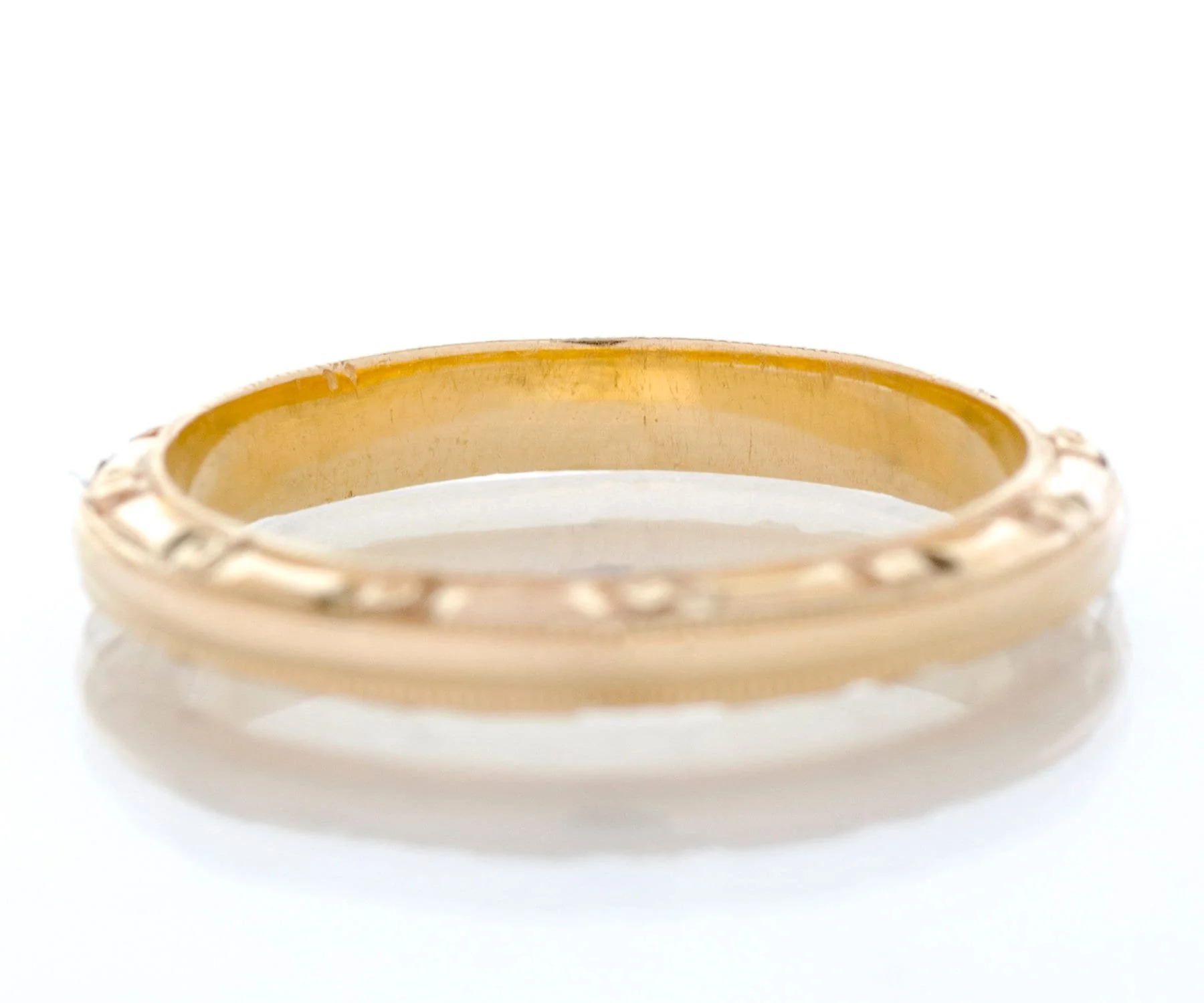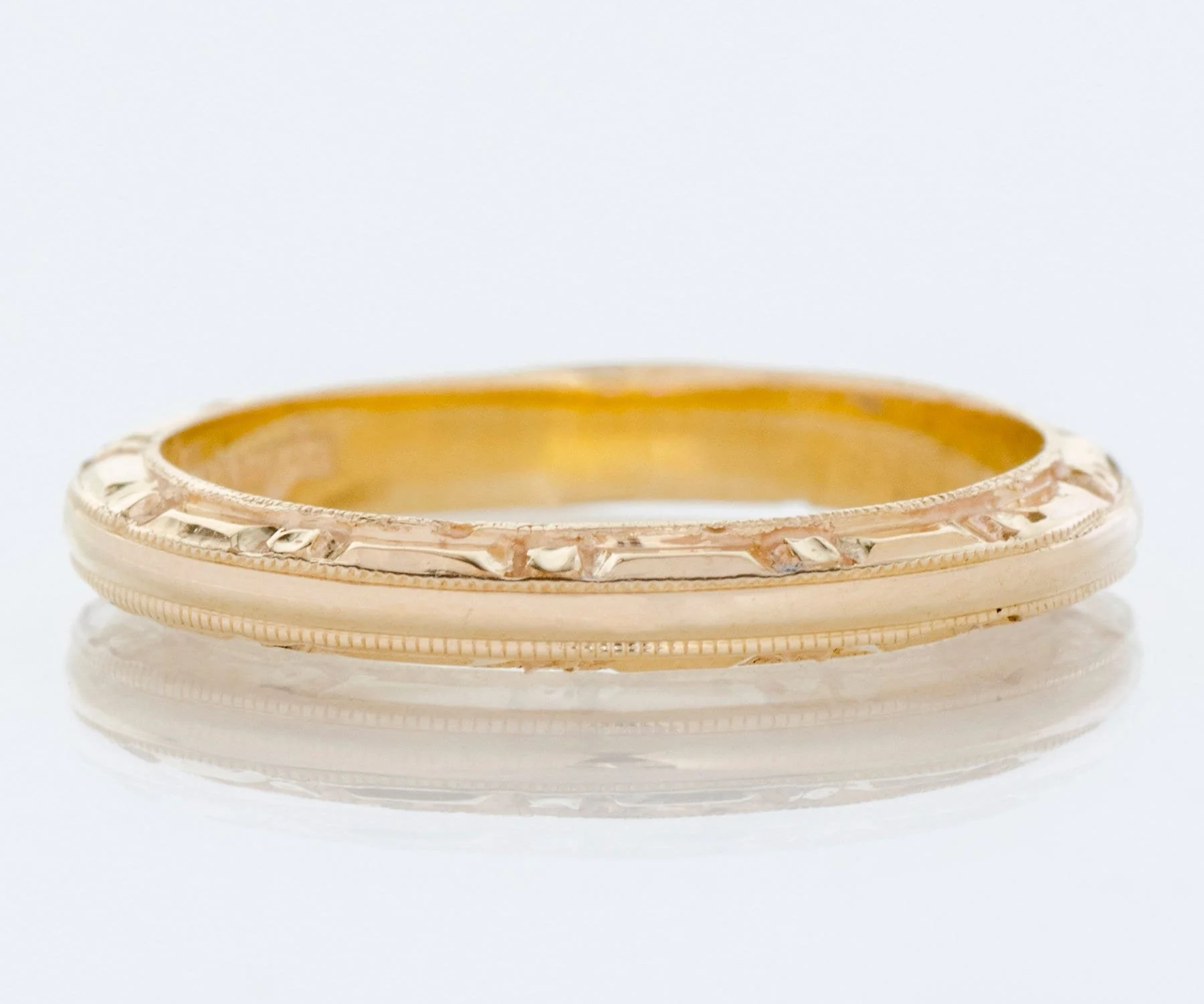 This Lohengrin antique wedding band in 14k yellow gold is a bit different in that the center is high polished and edged in milgrain and the sides display a crisp engraved pattern. This beauty is actually "new old stock". New old stock refers to product that has never been sold, so it is not pre-owned or used. Be the first to enjoy this antique treasure!