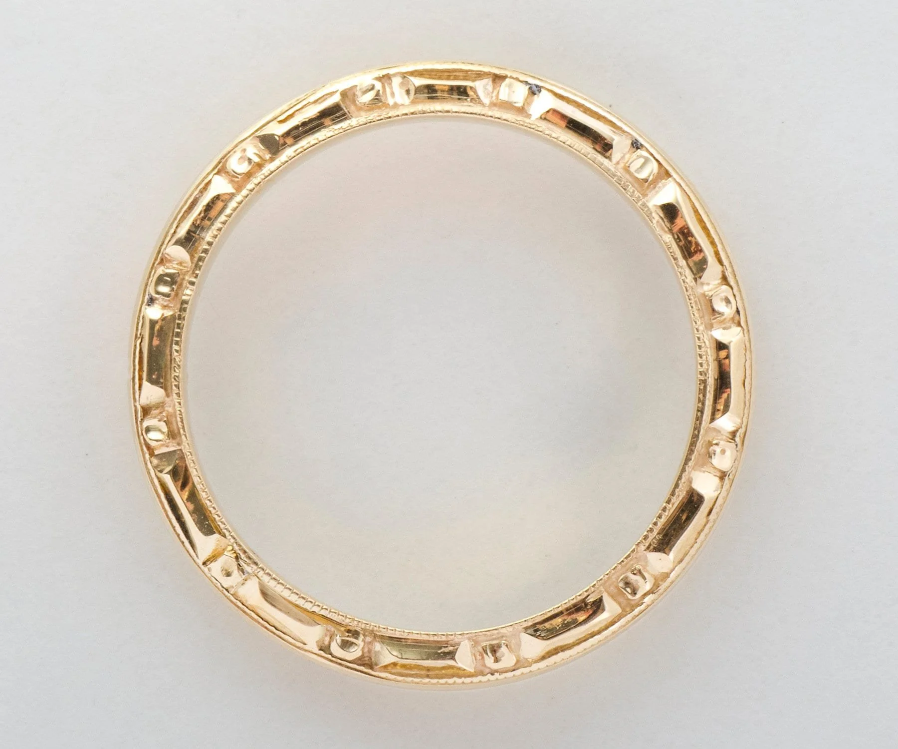 This Lohengrin antique wedding band in 14k yellow gold is a bit different in that the center is high polished and edged in milgrain and the sides display a crisp engraved pattern. This beauty is actually "new old stock". New old stock refers to product that has never been sold, so it is not pre-owned or used. Be the first to enjoy this antique treasure!