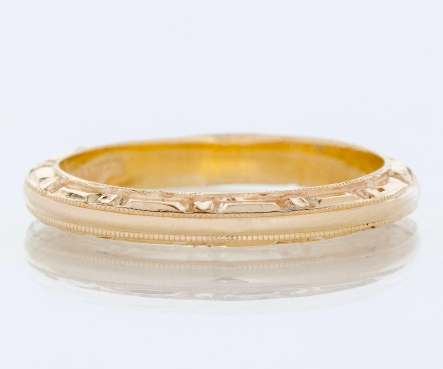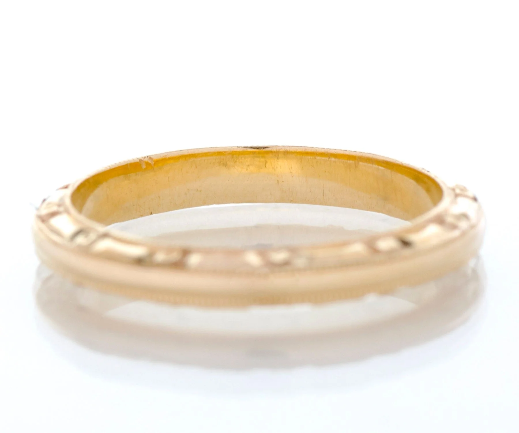 This Lohengrin antique wedding band in 14k yellow gold is a bit different in that the center is high polished and edged in milgrain and the sides display a crisp engraved pattern. This beauty is actually "new old stock". New old stock refers to product that has never been sold, so it is not pre-owned or used. Be the first to enjoy this antique treasure!