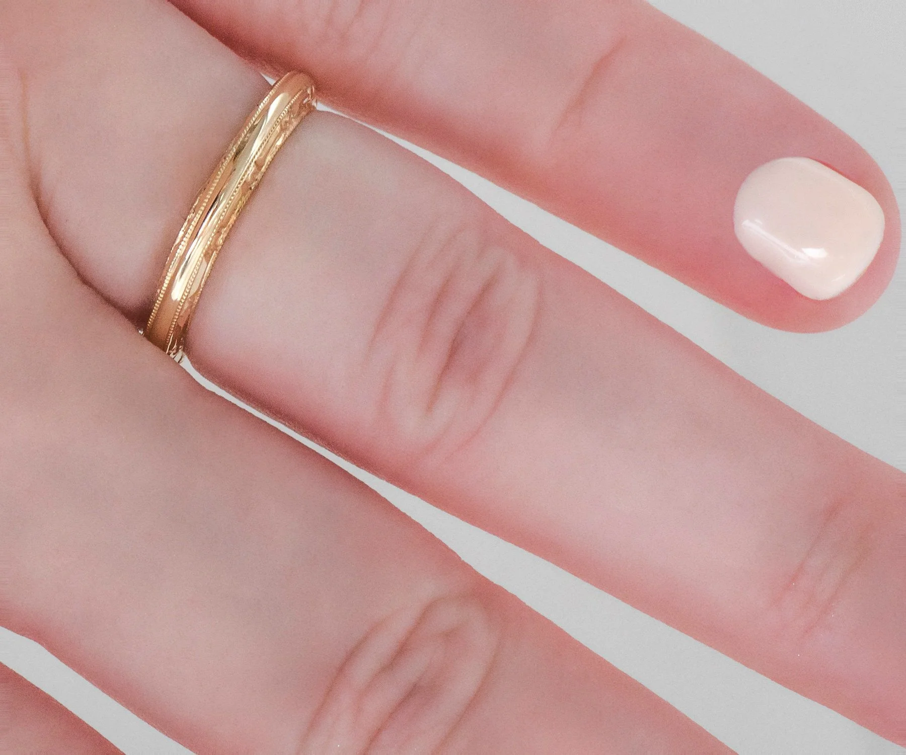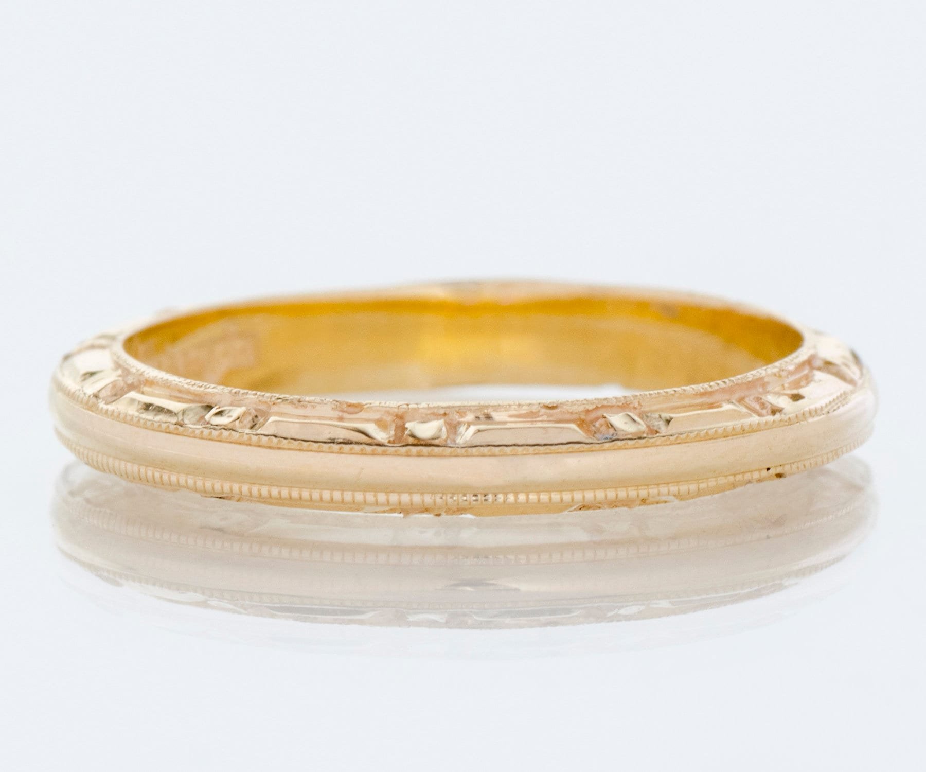 This Lohengrin antique wedding band in 14k yellow gold is a bit different in that the center is high polished and edged in milgrain and the sides display a crisp engraved pattern. This beauty is actually "new old stock". New old stock refers to product that has never been sold, so it is not pre-owned or used. Be the first to enjoy this antique treasure!