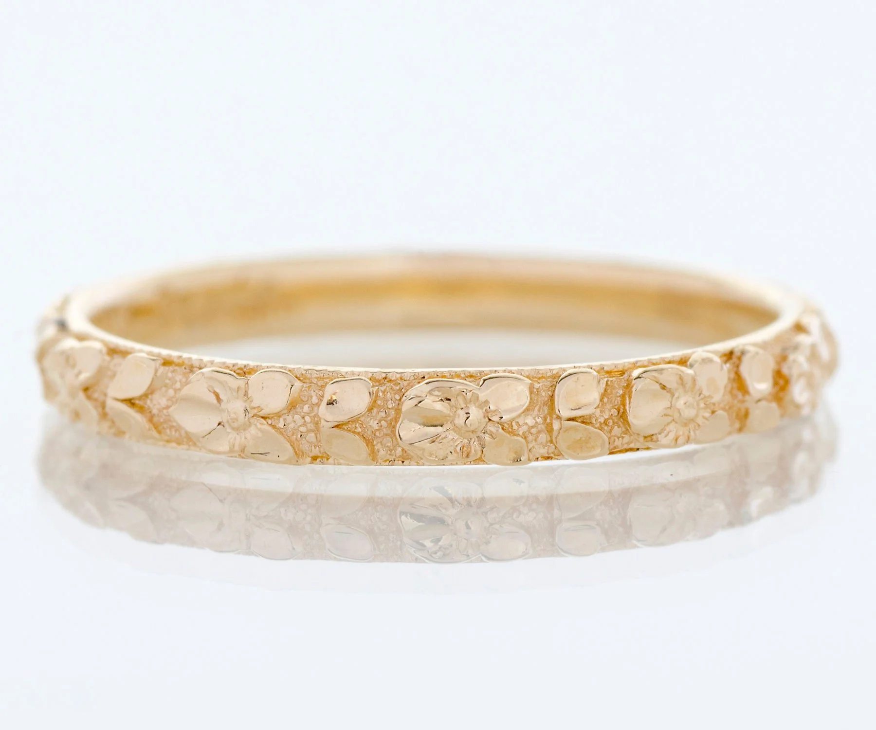 We are happy to offer this very romantic antique wedding band which we acquired as "new old stock" This means that the piece was never sold at retail but was created many years ago, not reproduced. A true antique as all of our other wedding bands. This one was crafted in bright yellow gold, displaying a crisply engraved floral pattern. Beautiful coupled up with your engagement ring of any era, wear it alone or as part of your unique and personal stacking combination.