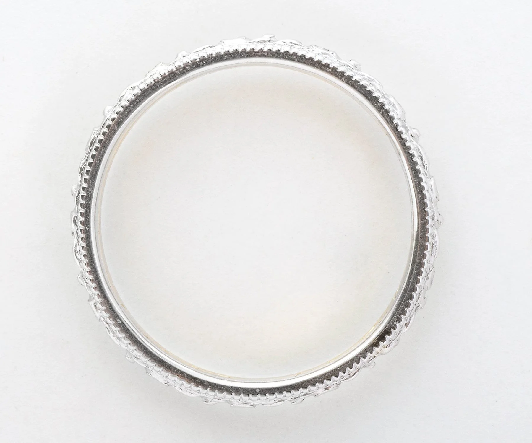 We love seeing the original engraving in our rings! It certainly allows us be precise on the date, while imagining a romance of so long ago. Crafted in both white and rose 18k gold, this antique engraved band is a beauty.