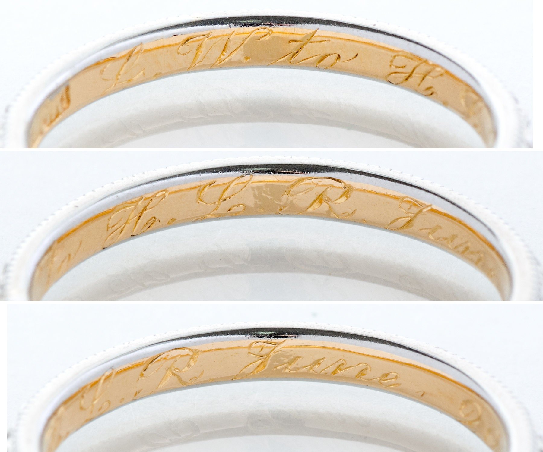 We love seeing the original engraving in our rings! It certainly allows us be precise on the date, while imagining a romance of so long ago. Crafted in both white and rose 18k gold, this antique engraved band is a beauty.