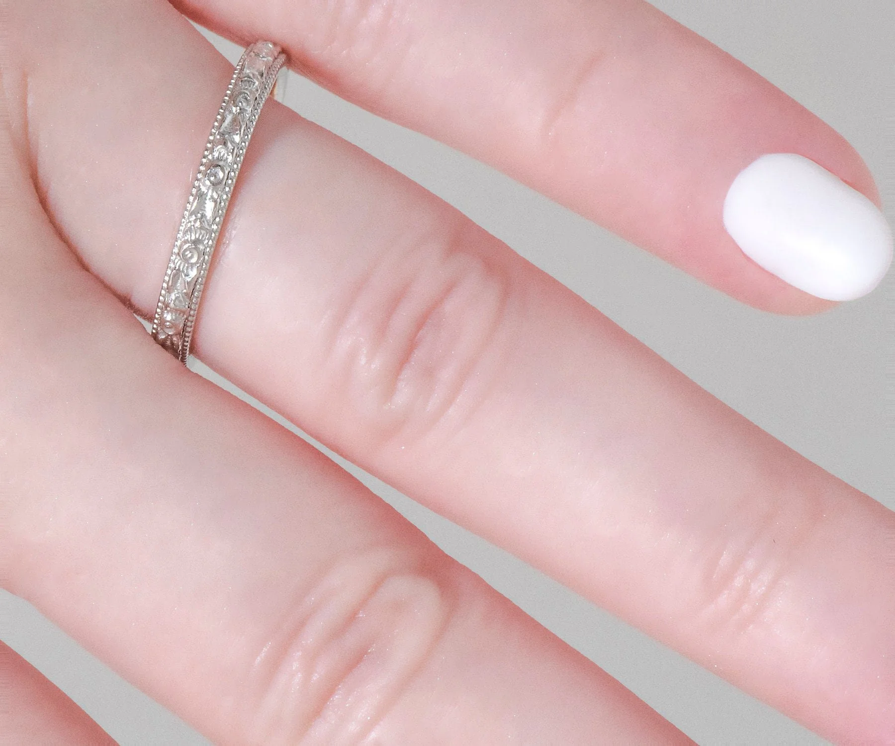We love seeing the original engraving in our rings! It certainly allows us be precise on the date, while imagining a romance of so long ago. Crafted in both white and rose 18k gold, this antique engraved band is a beauty.