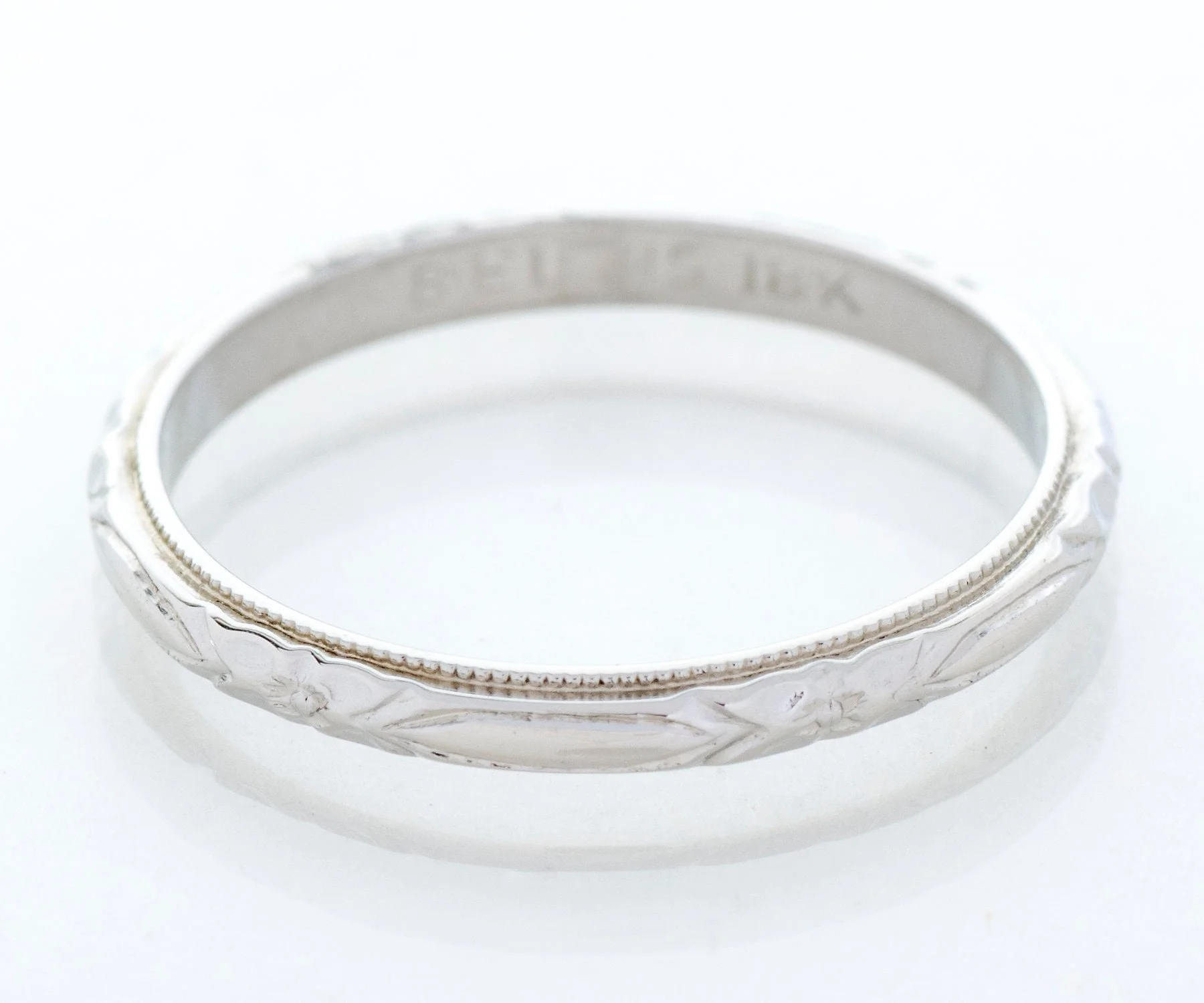 Antique Wedding Band - Antique 18k White Gold Belais Engraved Wedding Band 18k White Gold Designer: Belais Engraved Ring Size 5.5 Band measures approximately 2mm wide.