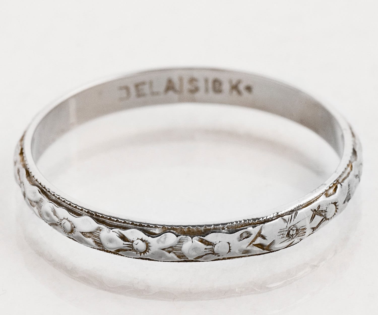 This beauty was created by the coveted designer "Belais", one of the earliest manufacturers of white gold jewelry. A lovely floral pattern surrounds this 18k white gold antique band and it would pair well with any engagement ring or as a lovely addition to your stacking combination.