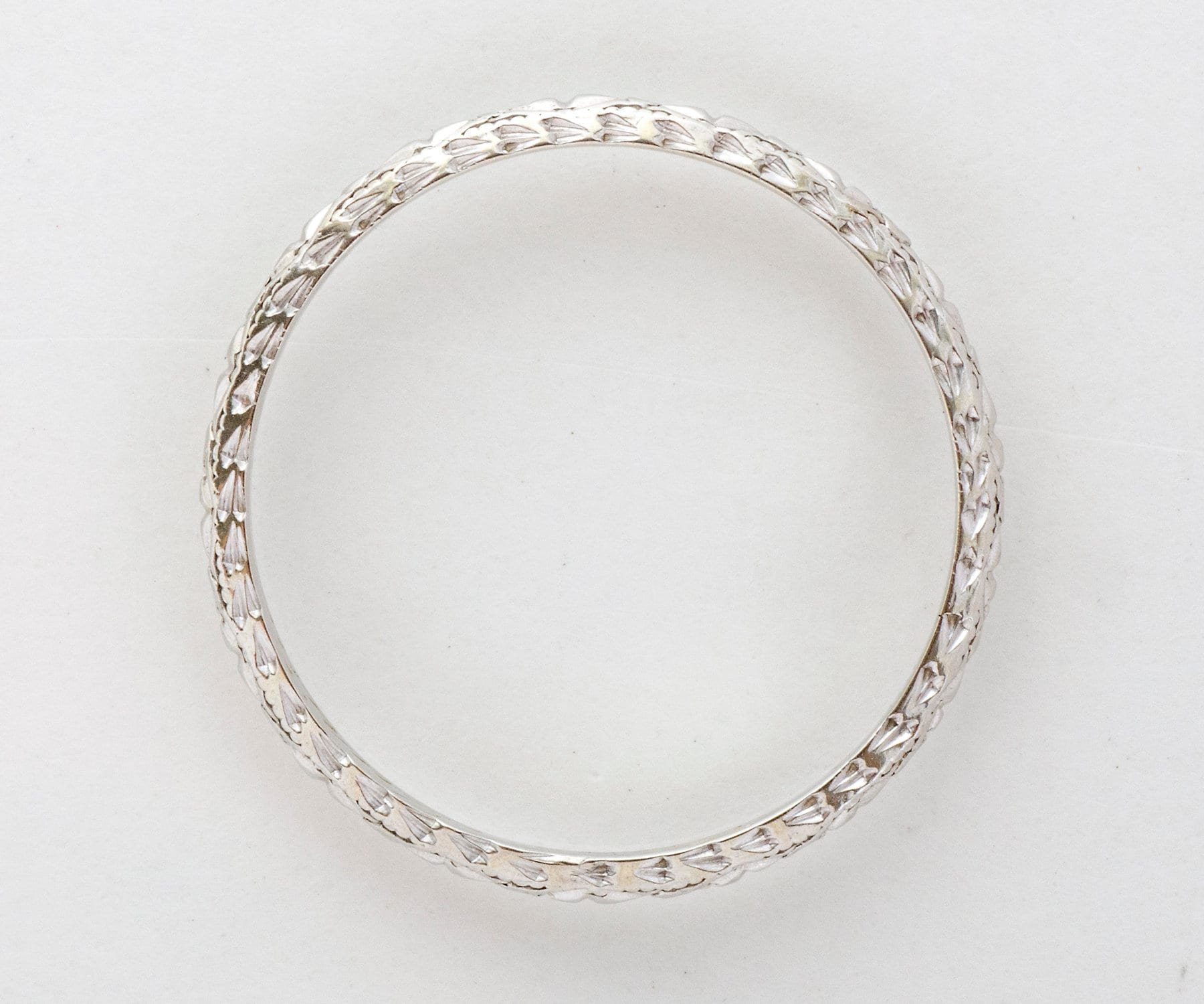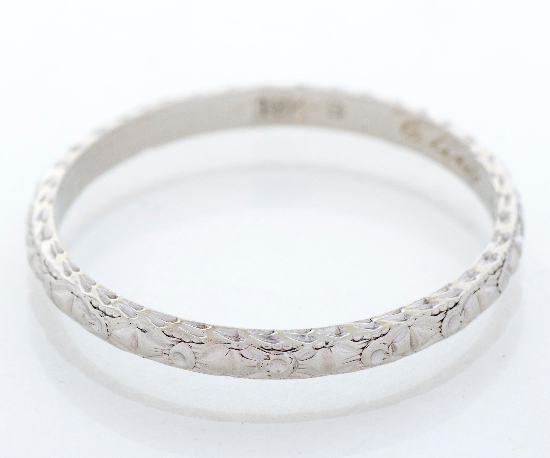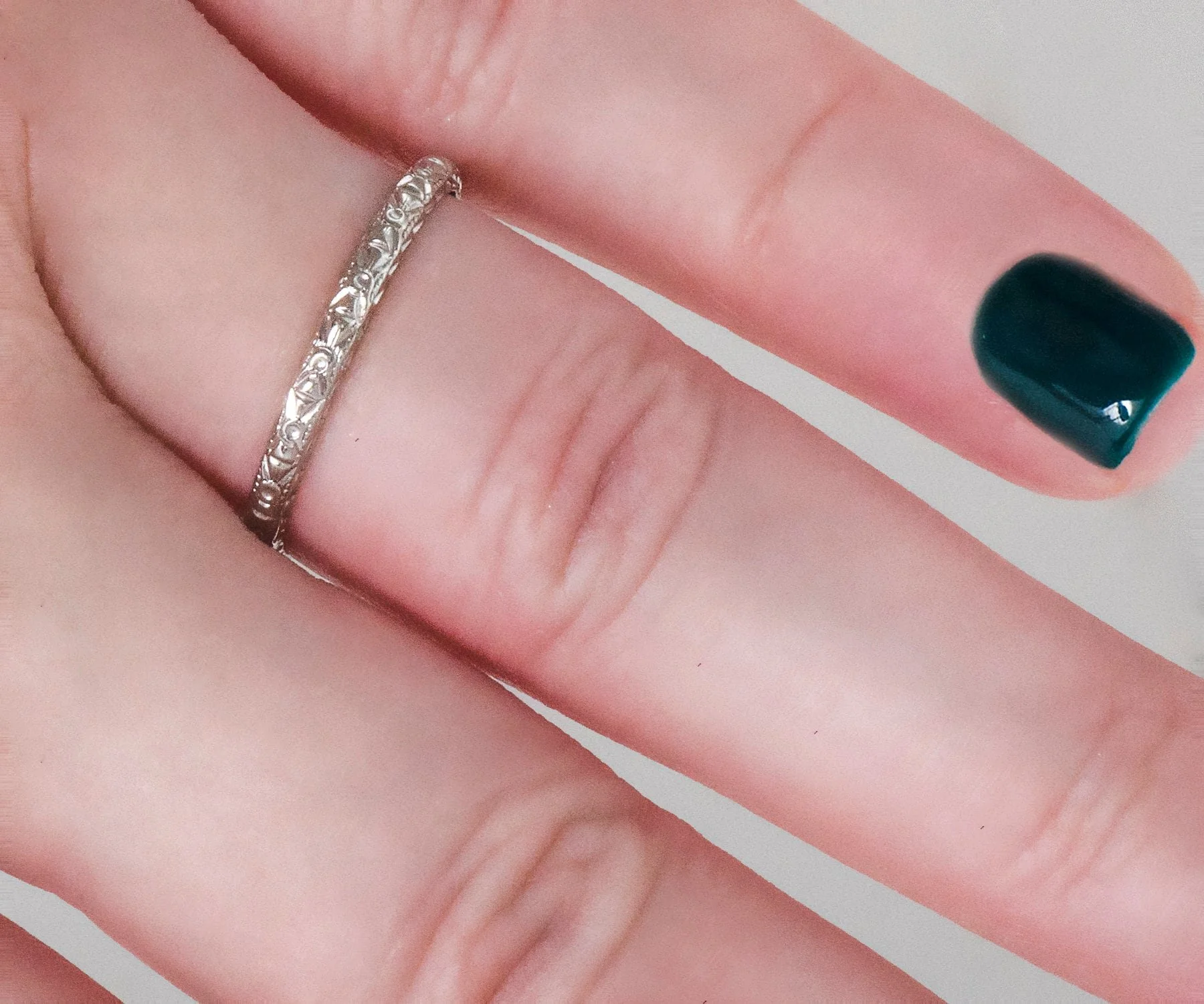 A dated antique band makes our hearts sing! We love to see the original engraving. This lovely wedding band was created in 18k white gold and shows a crisp floral engraving all the way around. This little treasure is 90 years young!