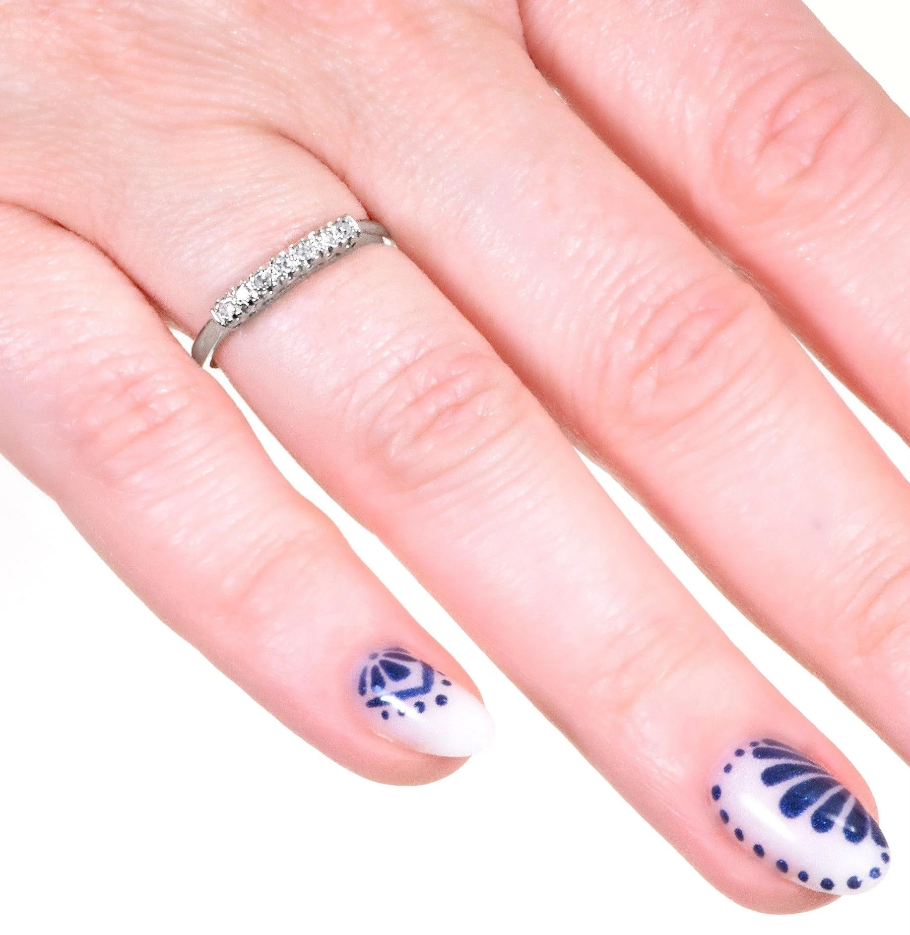 This antique beauty may be petite but she carries a big sparkle! Seven tiny diamonds are displayed across the front and give just the right amount of shimmer to either add to your engagement ring or wear alone. Crafted in bright 18k white gold, this is an easy one!