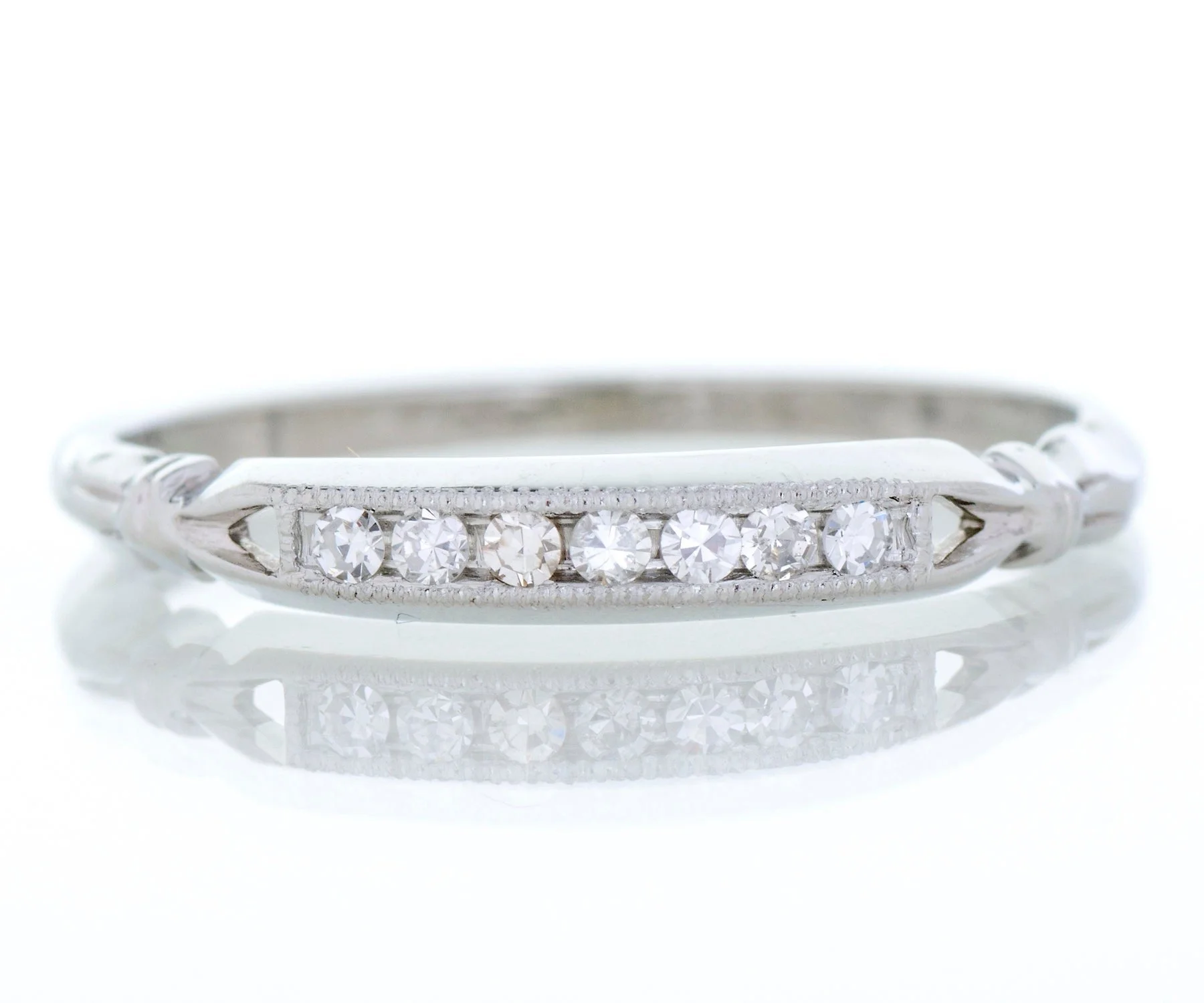Antique Wedding Band - Antique 18k White Gold Diamond Wedding Band 18k White Gold 7 Diamonds =.12ct VS1-SI1/G-H Ring Size 7 Band measures approximately 2.9mm at center, back of band is 1.5mm wide.