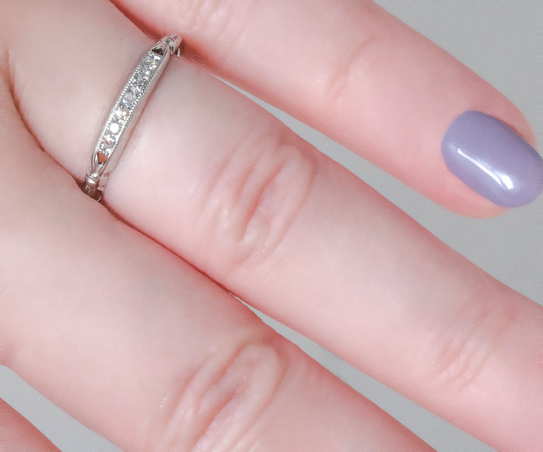 This very charming 18k white gold antique diamond band is a very easy one to either wear alone, perhaps as your travel or work band, coupled with your engagement ring of any era or worn as part of your eclectic and unique stacking combination.